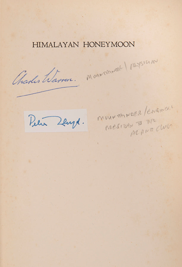 This copy is signed by Charles Warren, the doctor on both Hugh Ruttledge's and Harold Tilman's Everest expeditions. The other signatory, Peter Lloyd, was president of the Alpine Club and member of Tilman's Everest Expedition.