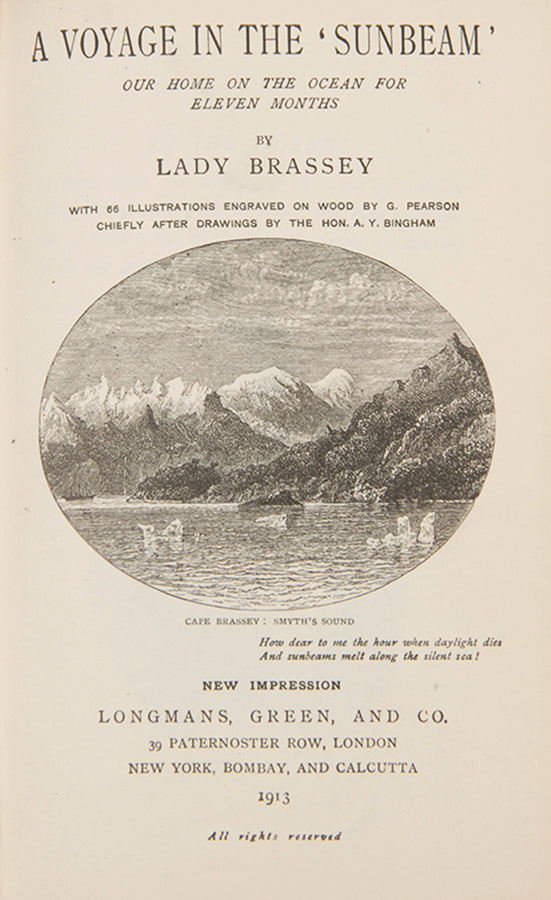 Lady Brassey's account of her celebrated circumnavigation - her first journey. She started across the Atlantic, visiting Brazil and Argentina before going through the straights of Magellan to Chile, then on to Tahiti and Hawaii across the Pacific, thence Japan and Canton, Singapore and Malaysia, and the stop of Ceylon before travelling to Aden and up the Suez back to the Mediterranean and home. Most of the account is made up of descriptions of Tahiti, Hawaii, and Japan, with her description of Hawaii pleased King Kalākaua so much he invested her with the Royal Order of Kapiolani.