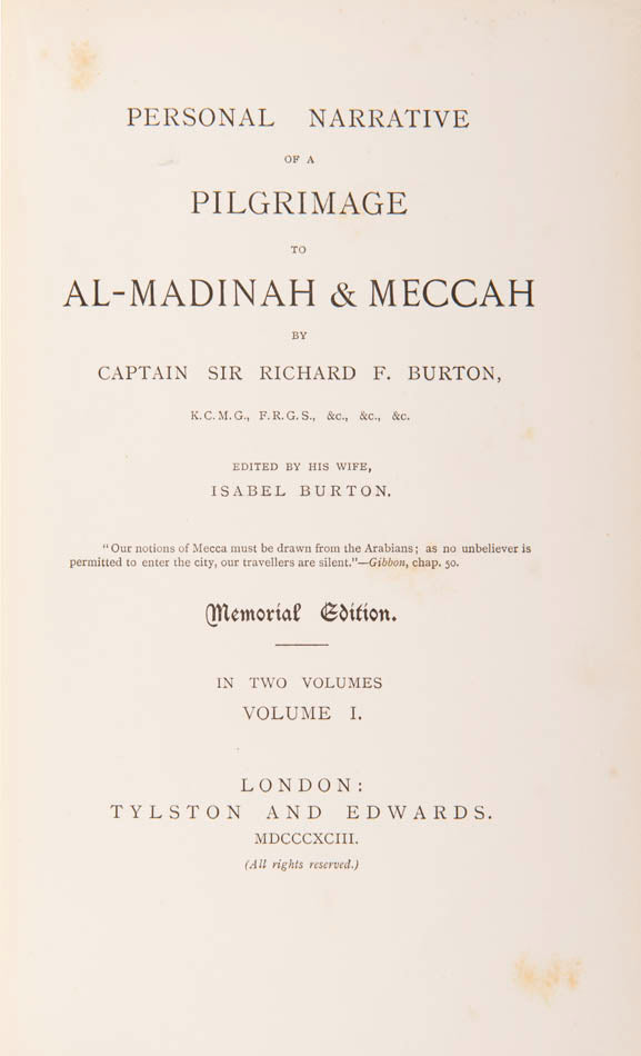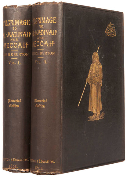 Memorial edition. 2 volumes, 8vo, xxviii, [4], 436; xii, [4], 479 pp., edited by Isabel Burton, her portrait as frontispiece to Vol. I, tinted lithographed plates, one coloured, folding map, original gilt pictorial cloth, light wear, occasional light spotting, a very good set.