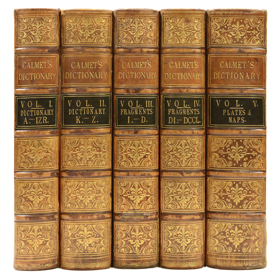 Illustrated with engraved plates and maps. A handsome five-volume set of Calmet's Dictionary of the Holy Bible, rendered into English with commentary and illustrations by the engraver and biblical scholar Charles Taylor (1756-1823).