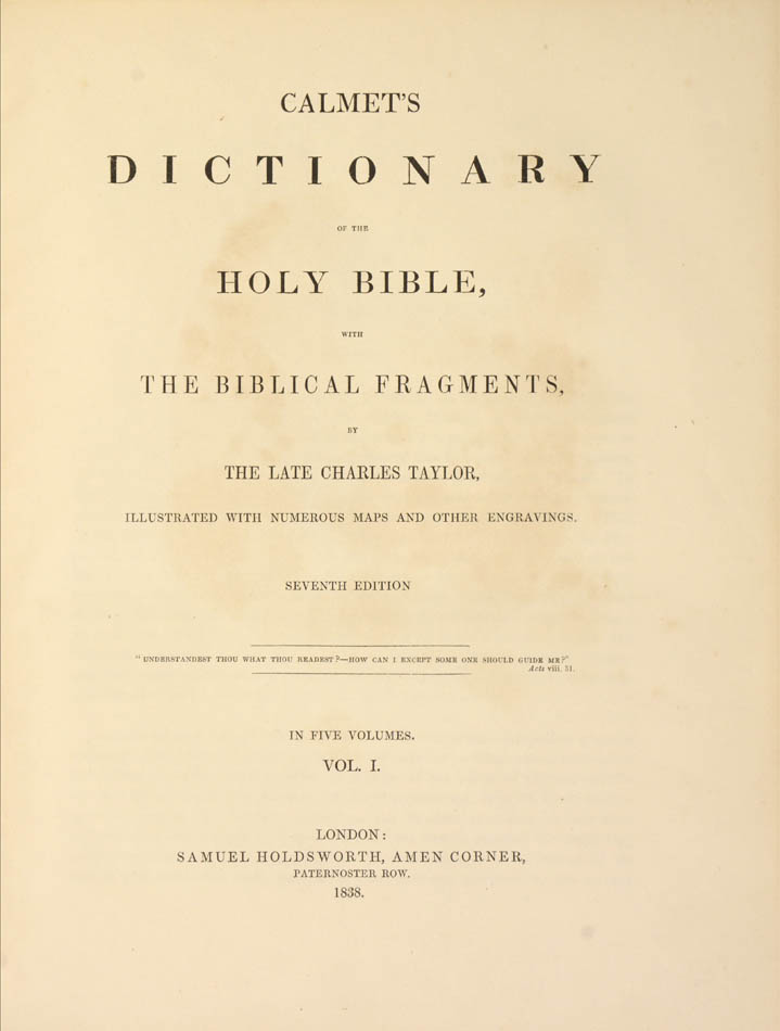 Calmet's Dictionary of the Holy Bible, with the biblical fragments, by the late Charles Taylor.