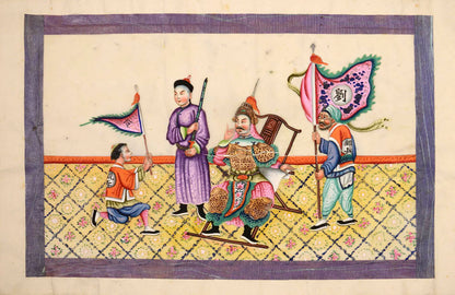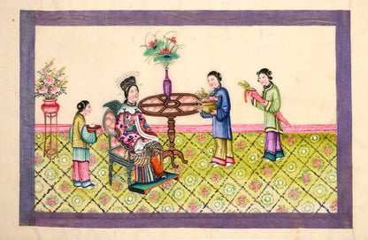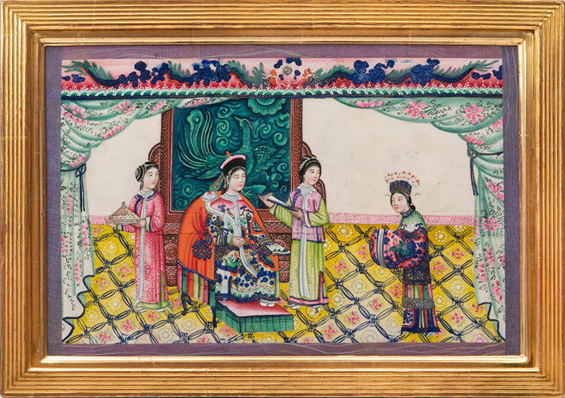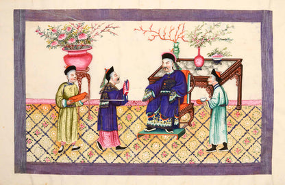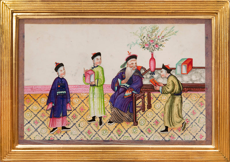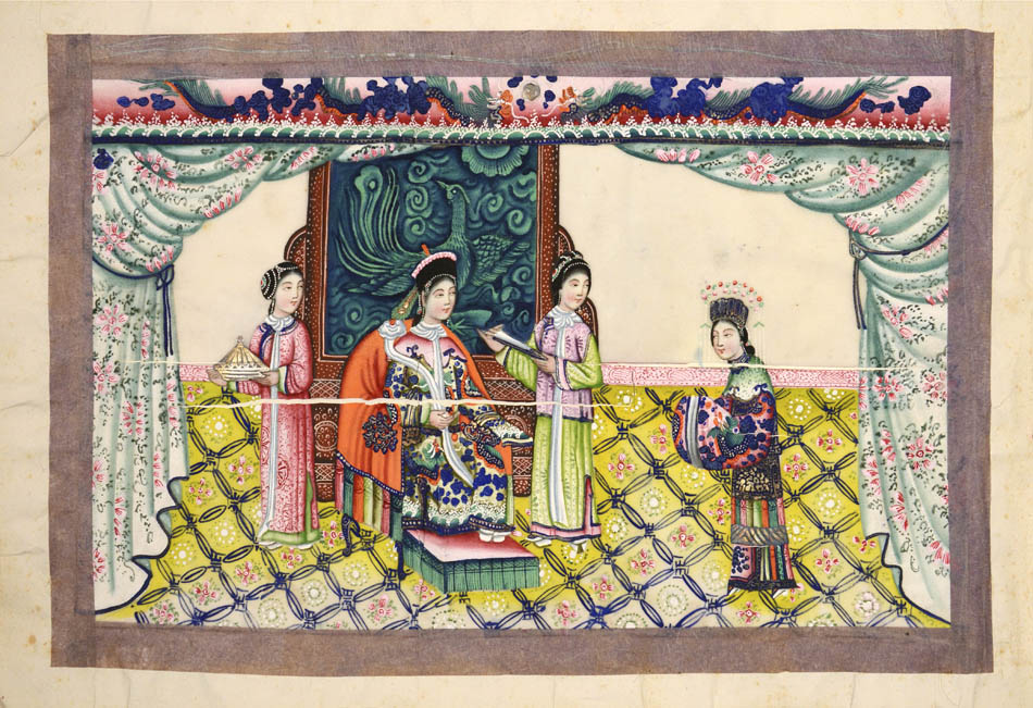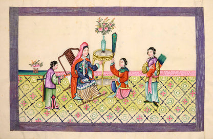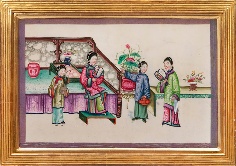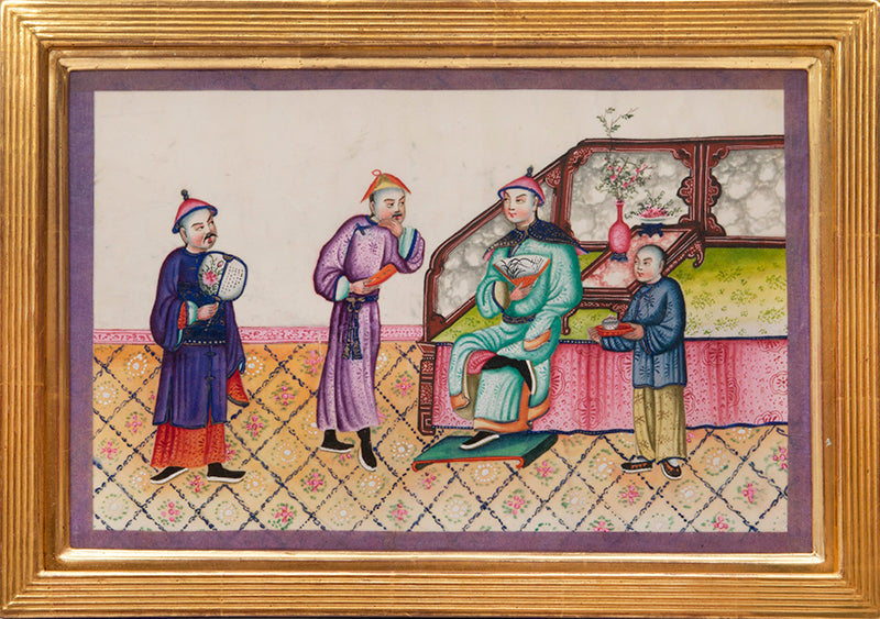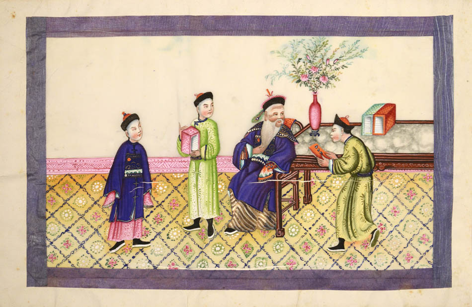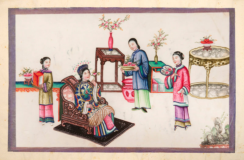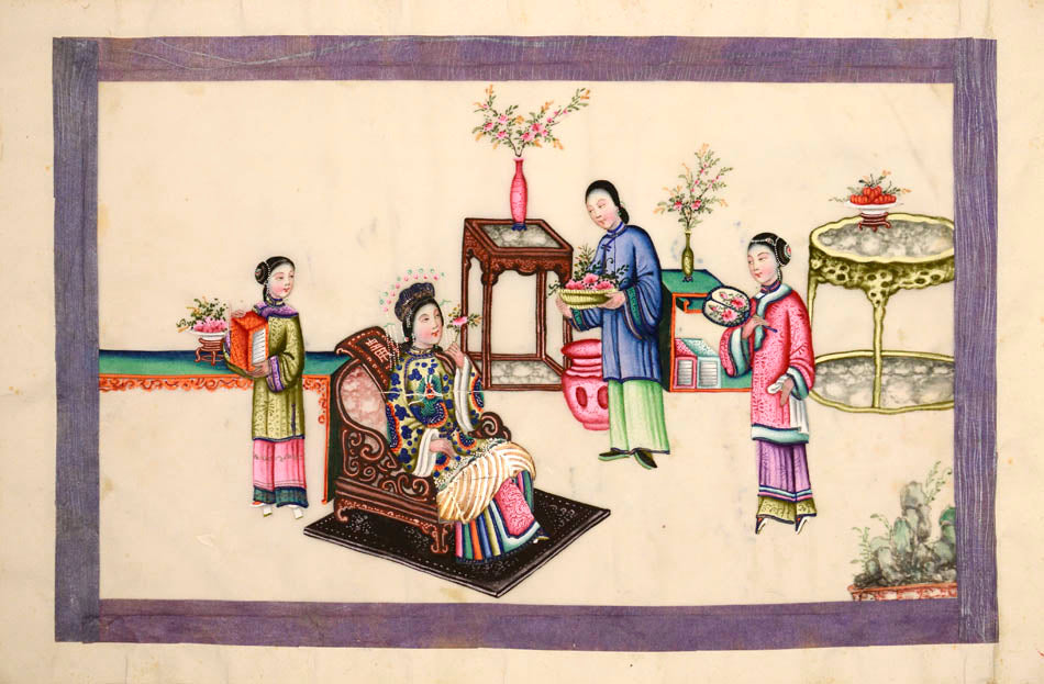 Pith came into use for painting to satisfy the increasing demand for small, inexpensive and easily transported souvenirs, following the massive growth in the China Trade in the first quarter of the nineteenth century. Paintings in oils, on board and canvas were costly and difficult to carry home. Earlier and more prestigious export water-colours had often been on a larger scale and painted on fine Chinese paper or on paper imported from Europe. The albums of pith paintings (and later the little glass-fronted boxes) were inexpensive, light, easy to pack and gave the pictures some protection on the long voyage home. Because many were sold in albums and hence protected from the light, they retain their bright colours to this day.