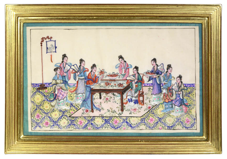Because of the nature of pith and its cellular structure, the gouache used by the Chinese sat on the surface and produced a bright and even sparkling effect. Very fine detail could be achieved but pith did not lend itself to the flat wash of colour favoured for European watercolours.