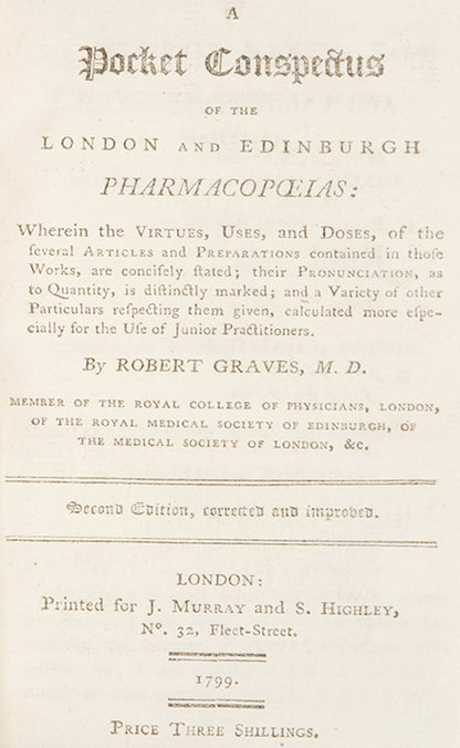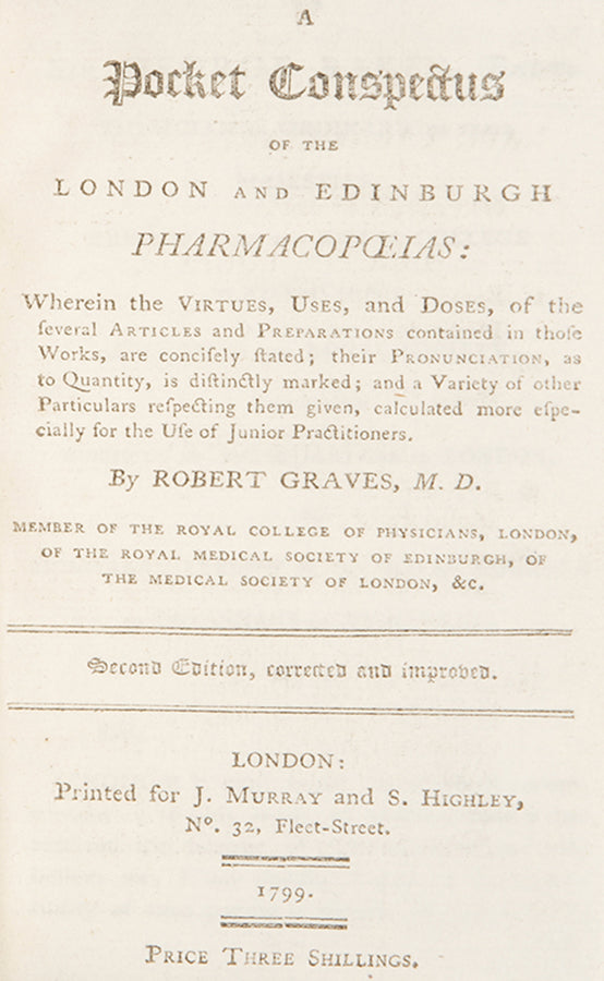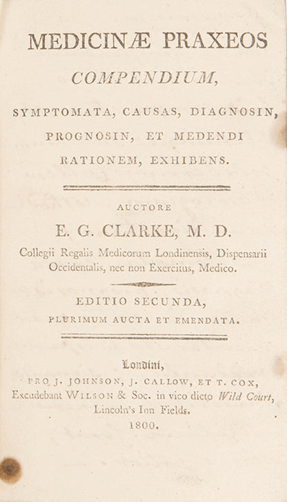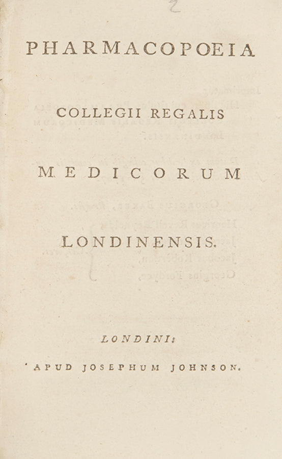 symptomata, causas, diagnosin, prognosin, et medendi rationem, exhibens. Editio secunda, plurimum aucta et emendata. London, J. Johnson, et al, 1800; 224pp. [Bound with] Royal College of Physicians. Pharmacopoeia. London, Joseph Johnson, [c. 1788]; 166pp. [And] GRAVES, Robert. Pocket Conspectus of the London and Edinburgh Pharmacopoeias... Second edition, corrected and improved. London, J. Murray and S. Highley, 1799; 116pp. [And] Guy's Hospital. Pharmacopoeia, in usum valetudinarii... recensitae editionis. London, G. Phillips, 1803; 123pp. [And] St. Thomas' Hospital, Pharmacopoeia in usum noscomii Londinensis. London, T. Bensley, 1800; 59pp. [And] General Rules to be Observed in Raising and Continuing a Salivation: With the method of cure, and treatment of such dangerous symptoms, as may accidentally occur. London, 1775; 17pp.