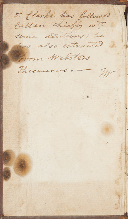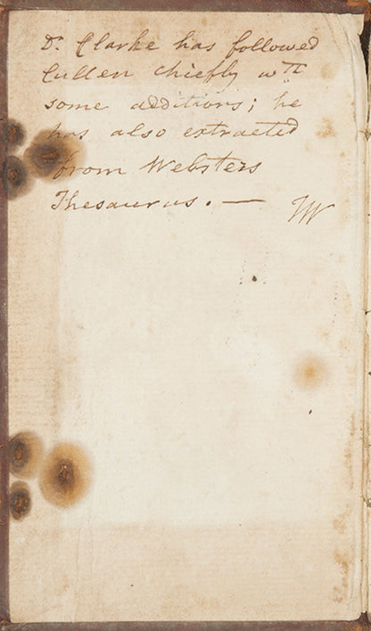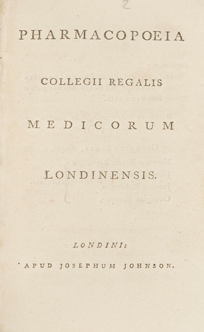 A very nice, pocket-sized sammelband containing six medical works dating from the turn of the nineteenth century, of which three are the official pharmacopoeias published by the Royal College of Physicians and Guy's and St. Thomas's Hospitals, and one an overview of the contents of the London and Edinburgh pharmacopoeias by an Irish physician. It is likely the the original compiler or an early owner had medical knowledge, as they have written an informed note on the front free endpaper pointing out that, 'Dr. Clarke has followed Cullen chiefly with some additions; he has also extracted from Webster's Thesarus'.Pharmacopoeias (lists of medical substances and their uses) had long been a popular genre, but they gained importance during the 17th century as medicine was increasingly professionalised and official publications could be used to centralise power within the physicians' societies and larger hospitals. For instance, the Royal College of Physicians' Pharmacopoeia Londinensis (text number two in this compilation), backed by a proclamation of King James, was 'an officially sanctioned list of all known medical drugs, their effects and directions on their use. No one was allowed to concoct any medicine or sell any substance if it did not appear in the Pharmacopoeia Londinensis'. Pharmacopoeias also proved popular with the educated general public, especially in English translations that began appearing around the middle of the century.