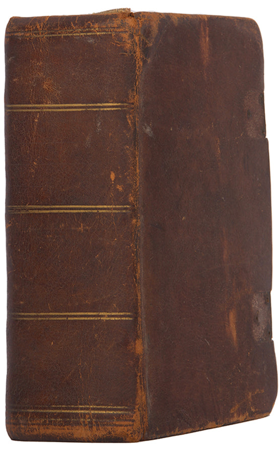 12mo (13 x 7.5 cm); contemporary manuscript notes on the front endpaper and verso of the title to the first text, rust marks and associated paper loss affecting early and late leaves, primarily blanks and endpapers; contemporary calf, double gilt fillets to spine panels, lacking the metal clasps, calf rubbed, headband slightly loose, very good condition.