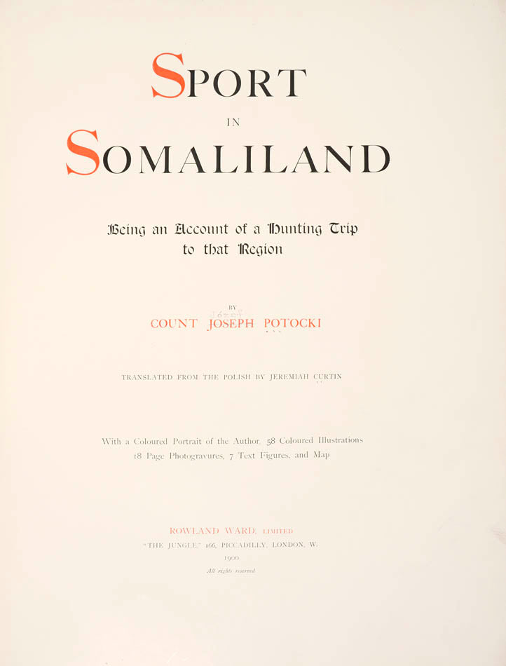 The volume commemorates his 1895 safari to the Haud region of Somaliland and then into the Ogaden where the party bagged the 'big five' and numerous antelopes, gazelles, etc. 'Excellent artwork' (Czech).