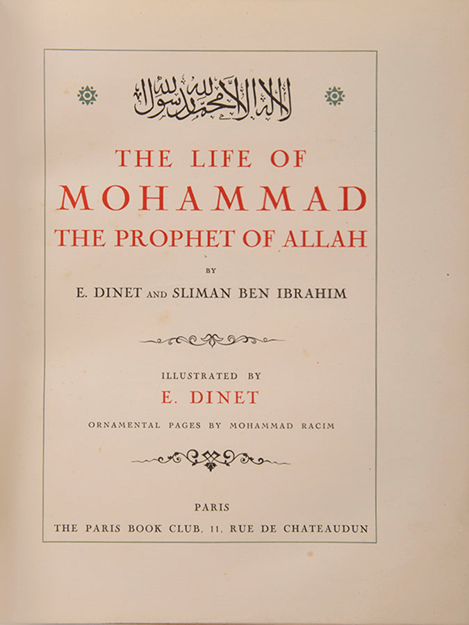 One of 875 copies, this numbered 388, 4to (325 x 260 mm), coloured illustrations by E. Dinet, decorations by Mohammad Racim, tissue guards, a few small spots else internally clean, fine full navy morocco preserving gilt motif from original cloth to upper cover, covers ruled in gilt, spine gilt in compartments with burnt orange labels, lettered in gilt, t.e.g., top edge of upper cover very slightly sunned otherwise very handsome copy.