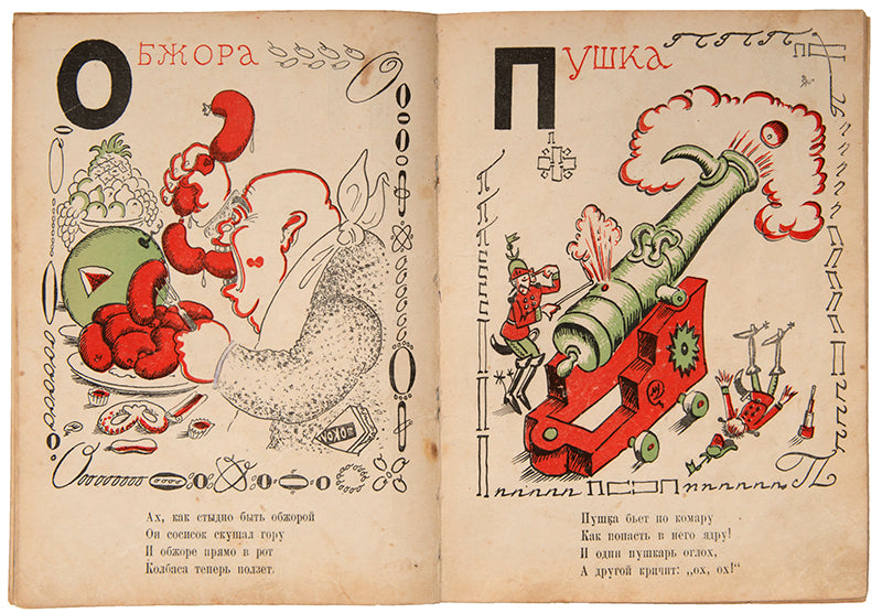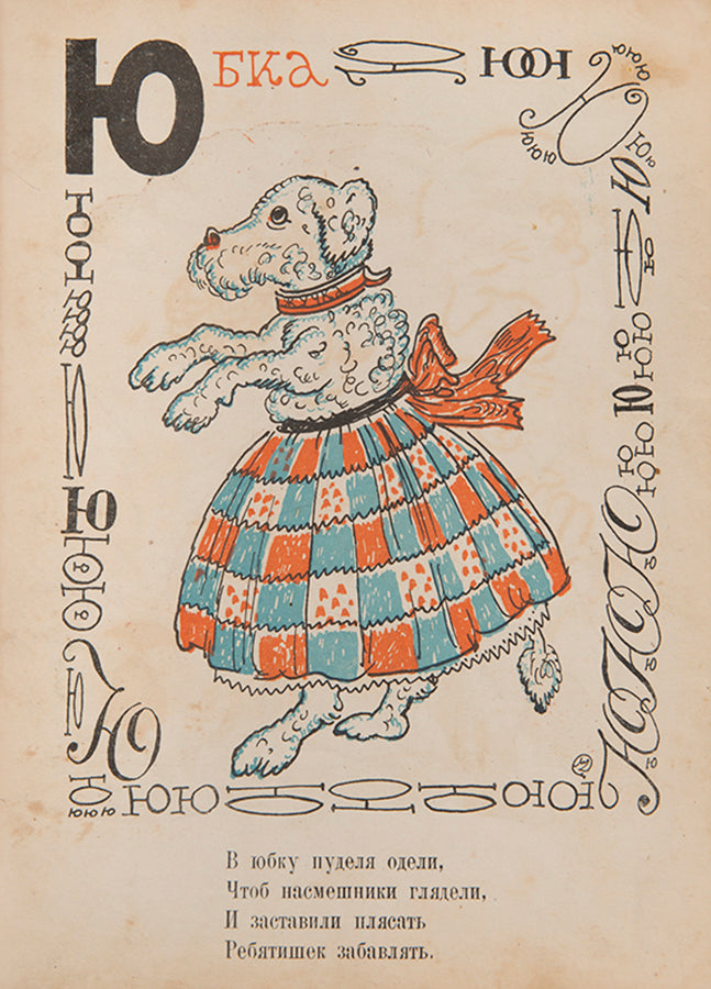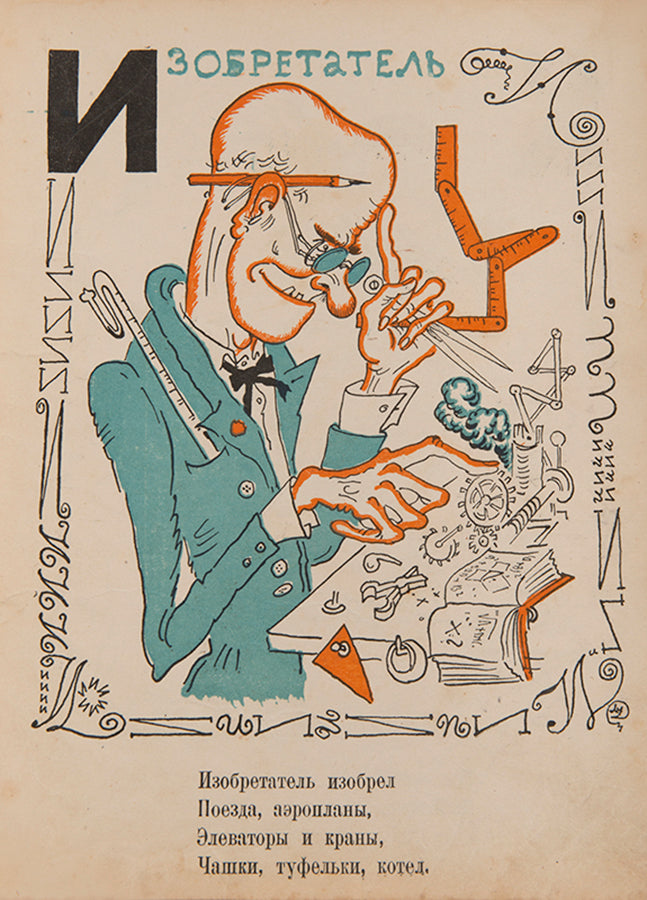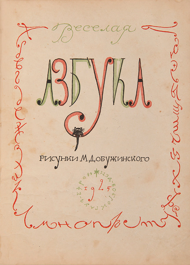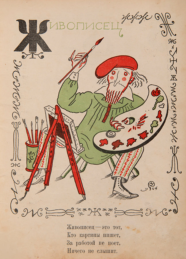 A scarce and humorous ABC from one of the most celebrated members of the Mir Iskusstva [World of Art] group. Dobuzhinsky began working on his Veselaia Azbuka in the summer of 1924, when he was living in Lithuania having permanently left the Soviet Union. The letters of the alphabet take on amusing characters and are surrounded by a decorative border of said letter in different typographical forms. A charming addition at the end of the work is a vignette of three letters which were axed in the orthographical reform of the revolution, placed in a glass cloche and dated 1917.WorldCat lists copies two copies in institutions, Princeton and the University of Michigan.