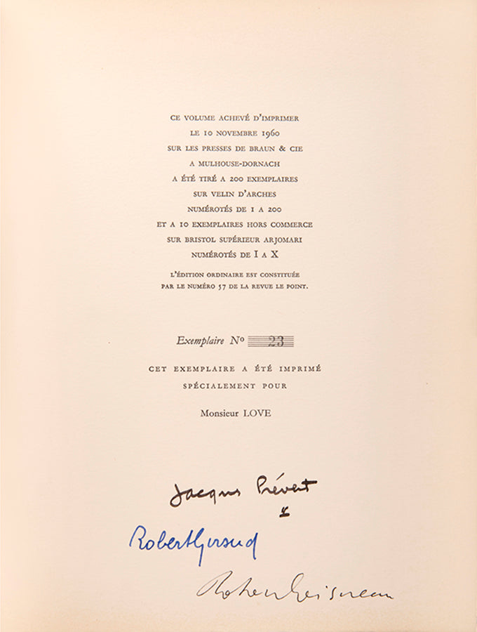First edition, number 23 of 200 copies on Velin d'Arches, signed by Robert Doisneau, Jacques Prévert, and Robert Giraud on the colophon; 8vo (254 x 191 mm, 10 x 7½ in); black-and-white photographs by Doisneau printed in gravure, texts by Prévert and Giraud; plain endpapers, burgundy silk-covered boards, spine and upper side stamped in gold, light fading toward edges, publisher's acetate dust-jacket, toned and lightly scuffed, near-fine; [iv], 48, [4]pp.