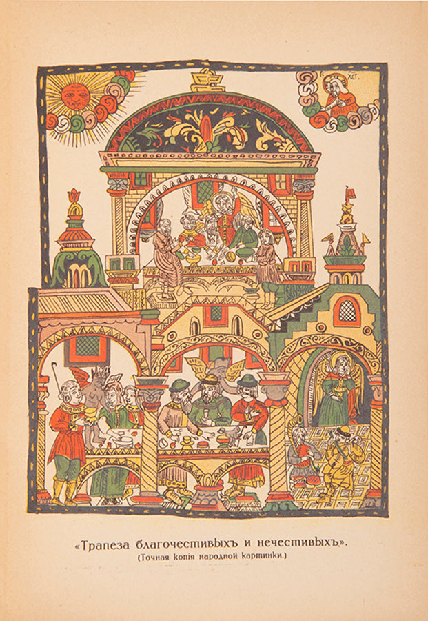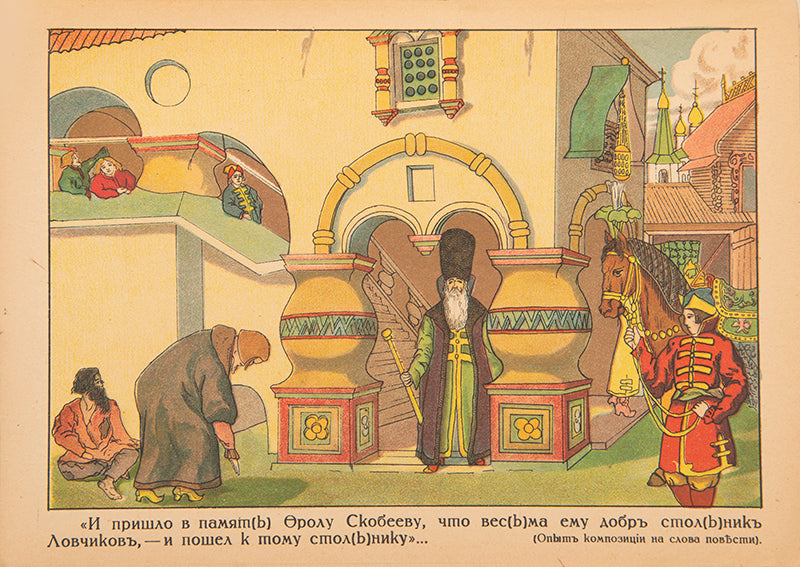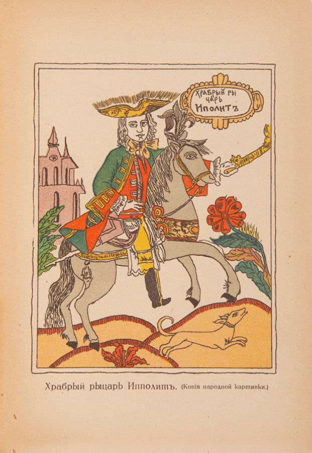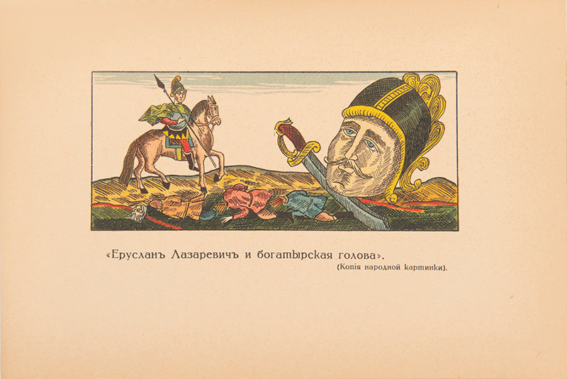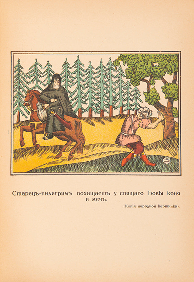 A remarkable collection of traditional Russian tales published by Sytin between 1914 and 1917, profusely illustrated with lubok prints as well as original drawings. The series was put together by Boris Dunaev, an art historian and expert in ancient tales, particularly from the north of the country. The popular style of printing was the trademark of Sytin, who wanted to attract the peasant and merchant classes with stories that were rooted more in folk tradition than Western educated novelists.Sytin himself came from a peasant family. Born in 1851 in a tiny village in the Kostroma region, his first experience of book selling was on his uncle's stall at the Novogorod fair, aged twelve. A year later he moved to Moscow and shortly afterwards acquired his own printing press. His commercial success came with mass producing calendars, fortune-telling charts, leaflets and books. The works which were cheaply produced and attractively illustrated helped increase the literacy of previously isolated communities.