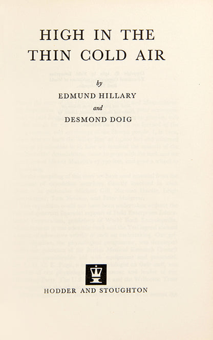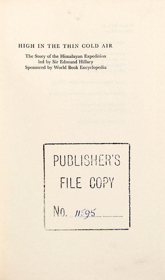 This publisher's file copy contains many chapters of exciting adventures. The main ourpose of this expedition was to carry out physiological research into high altitude acclimatization. Desmond Doig, journalist, recounts the search for the abominable snowman or Yeti.First edition. 8vo, numerous illustrations, "publisher's file copy" stamped on half title; publisher's blue grey cloth,lettered, original dust jacket; a very good copy; 287pp