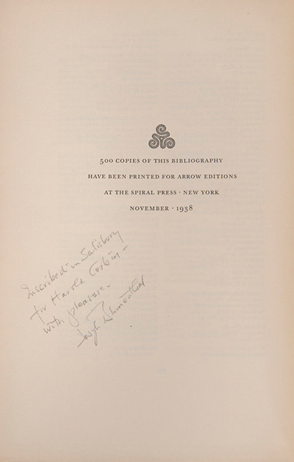 Inscribed by Joseph Blumenthal, the founder of the Spiral Press, to the author Harold Corbin: 'Inscribed in Salisbury for Harold Corbin - with pleasure. Joseph Blumenthal'.