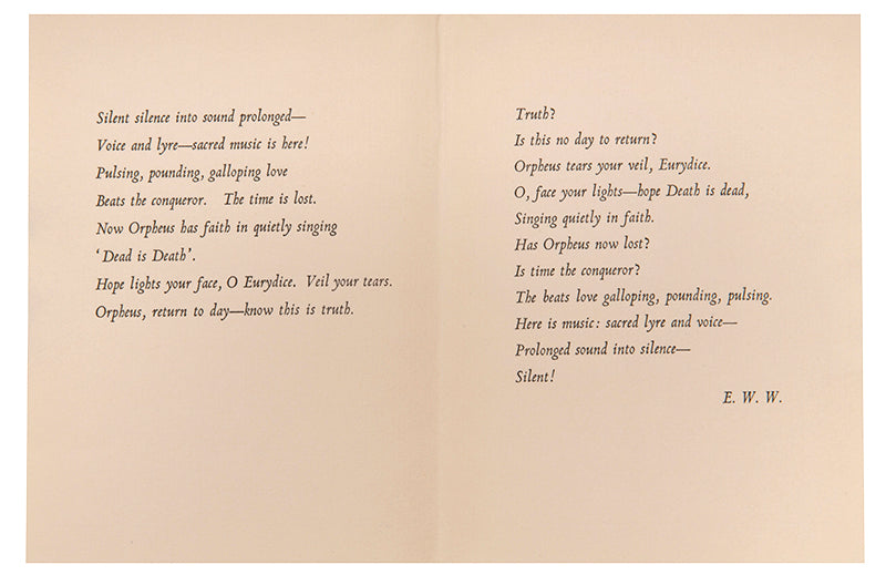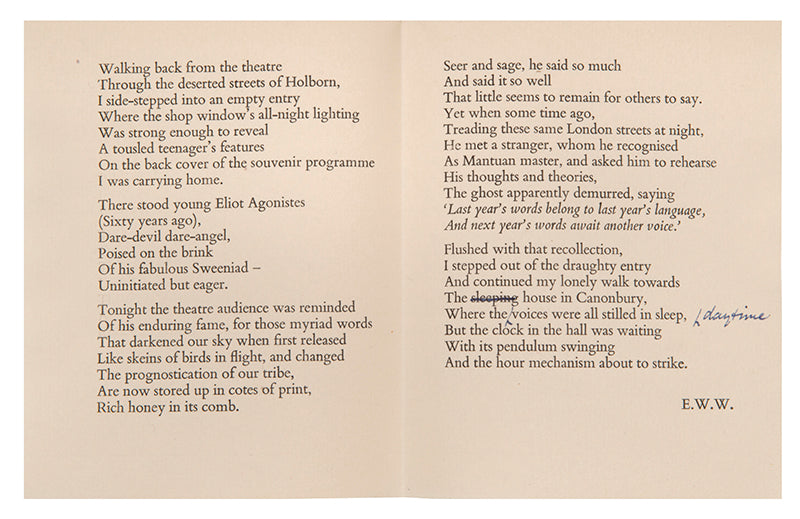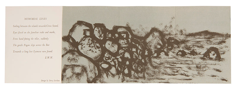 Thirteen poems, most 12.8 x 10.2 cm; scattered light spotting (not affecting text), title borders to 11 poems in various colours, Memorial Lines design by Terry Durham, correction in ink to 'Homage to T.S. Eliot'; publisher's printed card, folded as issued, housed in custom red cloth solander box (15.1 x 12.1 cm), red morocco spine label with gilt lettering, a very good set.