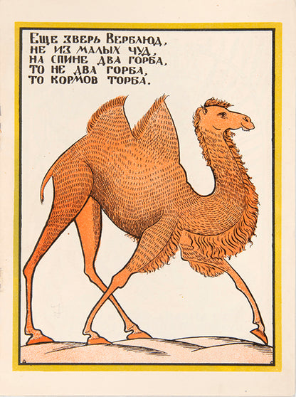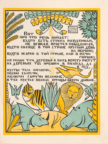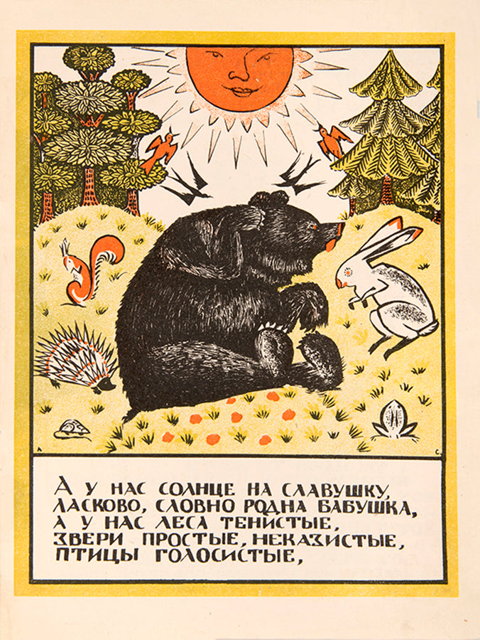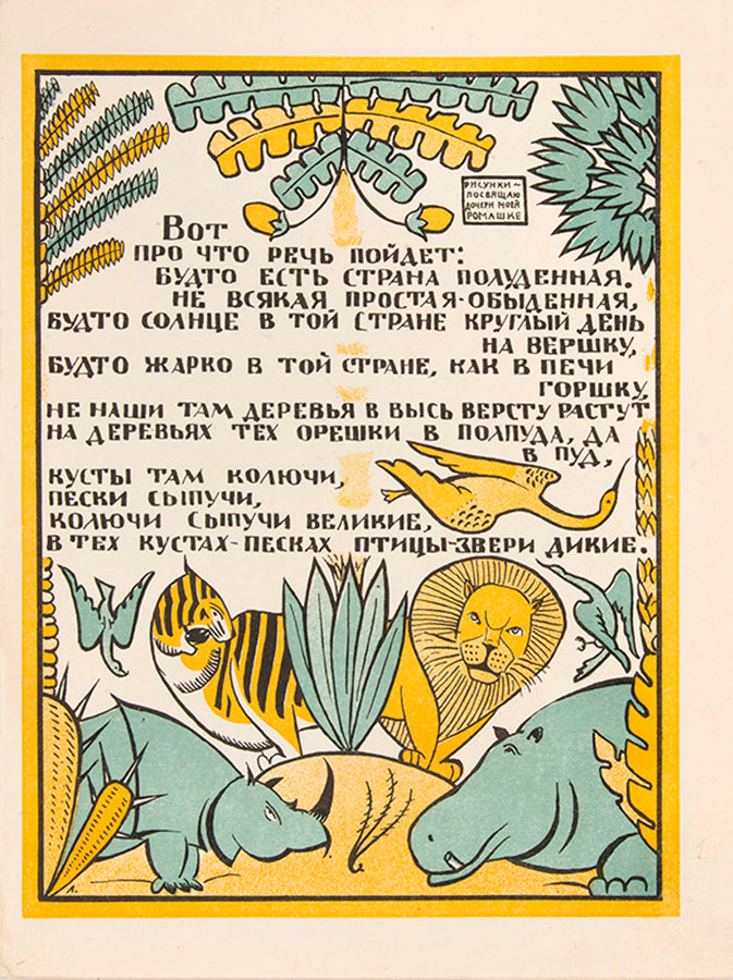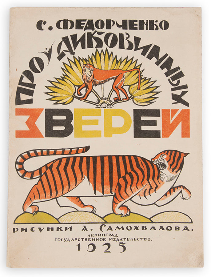 The illustrations for Pro dikovinnykh zverei perfectly demonstrate the relationship between traditional Russian popular prints (lubki) and the avant-garde style which erupted at the beginning of the twentieth century. Samokhvalov uses bold lines, flattened figures (or in this case animals), borders and bright colours, all of which are similar to cheaply printed lubok woodcuts. Much like Petrov-Vodkin, Samokhvalov was also influenced by religious art and worked on the restoration of frescos in Staraya Ladoga in 1926.