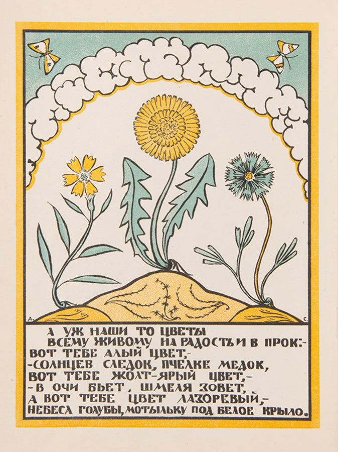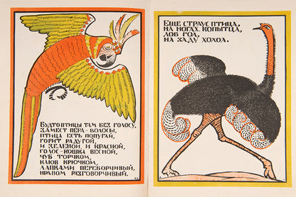 The Mir Iskusstva group believed that book illustration should be considered an art form in itself and each design aspect should be carefully considered. It is in this vein that the typography perfectly reflects the overall aesthetic of the book and the illustrations work in harmony together across a double-page spread. This holistic approach was espoused before the revolution but was now being taken in a new direction by Soviet artists working for the state publisher.