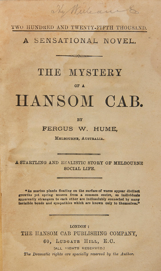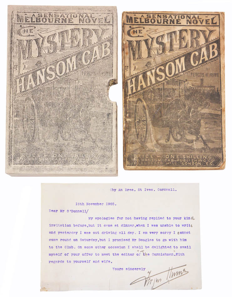 Early issue, 'two hundred and twenty-fifth thousand'; advertisements at front and end, one advertisment leaf loose, some browning/foxing to leaves at front and end; publisher's pictorial wrappers worn and soiled, some repair work to around spine but original printed backstrip present; together with a loose typed letter signed from Hume to a Mr O'Donnell dated 10th November 1905, both housed in a modern slip-case, reproducing the top and rear boards of the book.