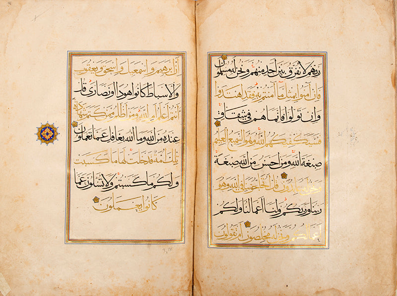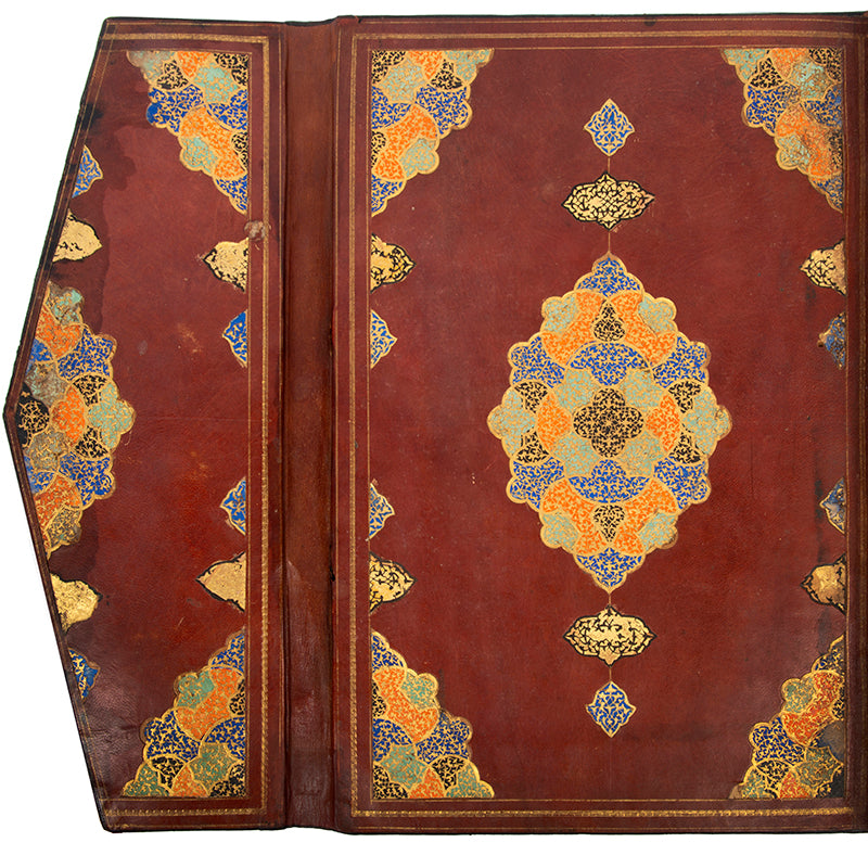 Single volume, illuminated manuscript on paper, in Arabic, containing the text to the first Juz' of the Qur'an, being Surah Al-Fatihah 1:1 to Surah al-Baqarah 2:141, complete in itself, 23 leaves, single column, 8 lines fine muhaqqaq calligraphy copied in alternating lines of black and gold, opening two leaves with elaborately decorated borders, opening two surahs copied in gold, text-blocks framed within multiple polychrome rulings, gilt verse markers of intricate hexagonal shapes, important divisions of the text marked with ornaments to the margins, in gold, a fine manuscript; housed in a contemporary fine Safavid binding with flap, outer covers of black leather with gold block stamped central panel, framed within a gold block stamped border, both adorning intricate floral designs, doubleurs of russett leather with central medallions and corner-pieces painted in polychrome with gold filigree detailing, extremities skilfully repaired, hinged strengthened, a very handsome example. 370 x 250mm (14½ x 9¾ inches).