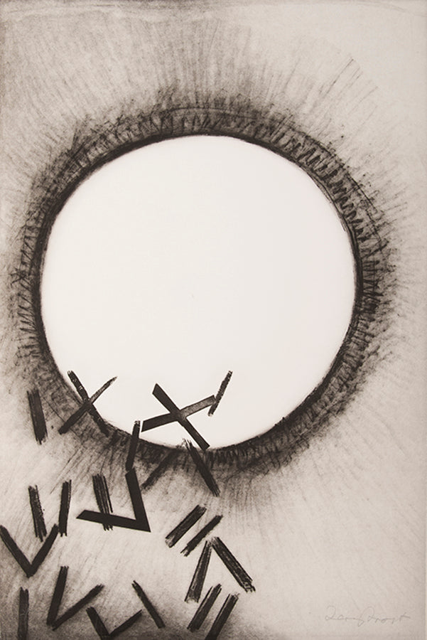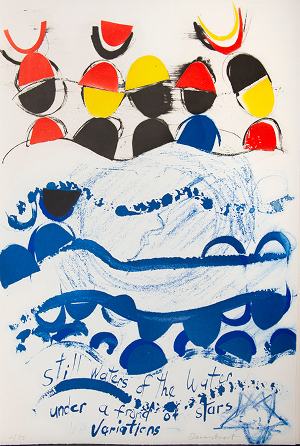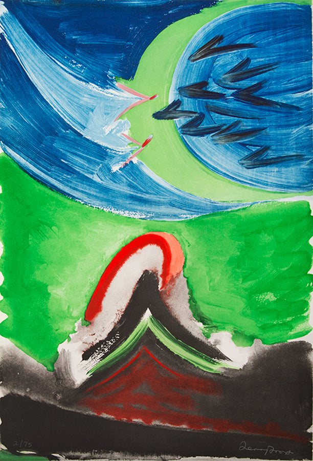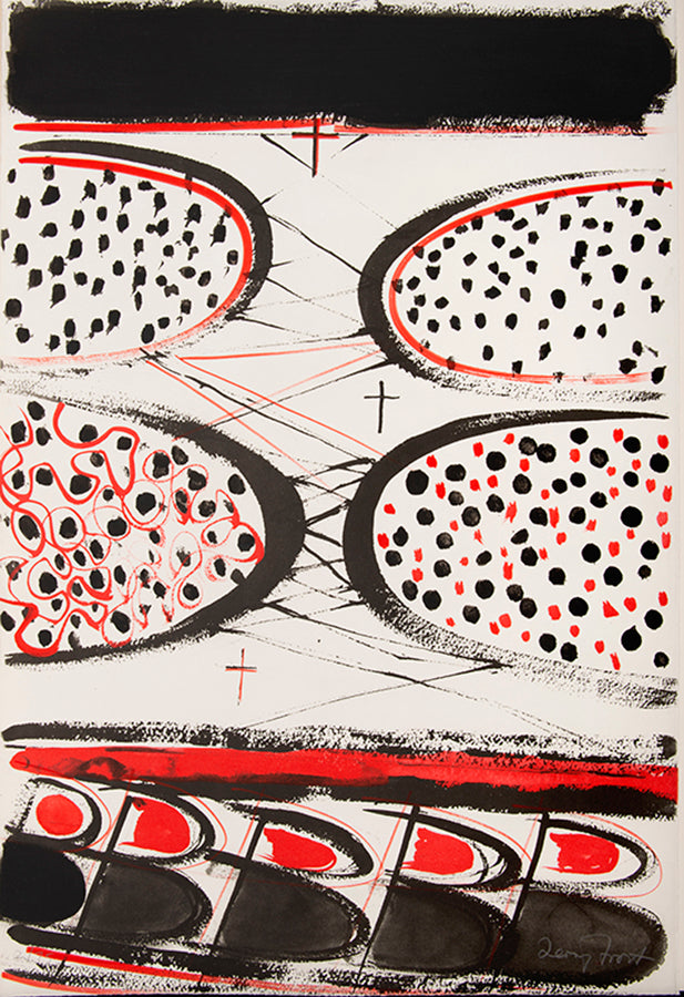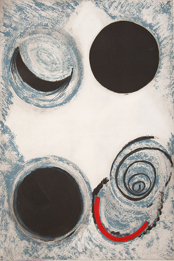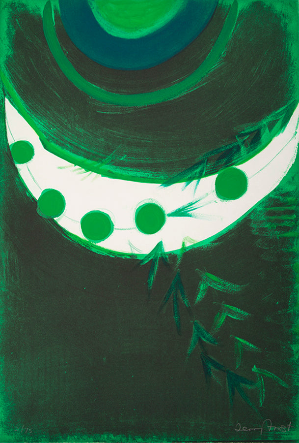 By 1989, Frost had developed his Lorcan theme to the point where he wished to dedicate a whole suite to the Spaniard's poetry, an assembled box of printed images that would encapsulate his cohabitation with these words over the past two decades. Eleven poems were chosen, with eleven etchings to accompany. In their strength of colour, form, and harmonious arrangement, their technical complexity, involving multiple processes including hand-colouring and embossing, they are undoubtedly the most accomplished and coherent of Frost's many portfolios of prints.