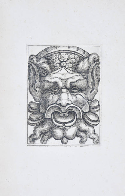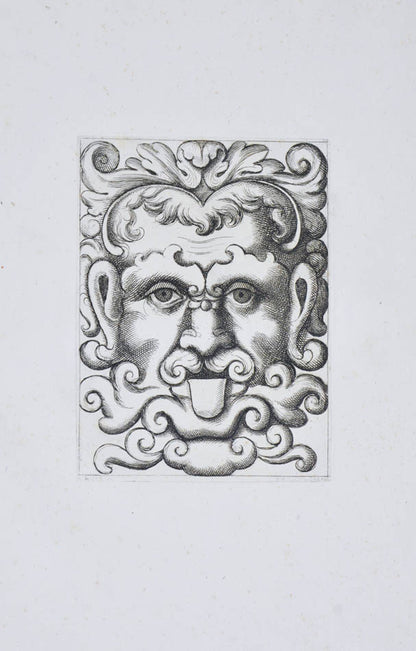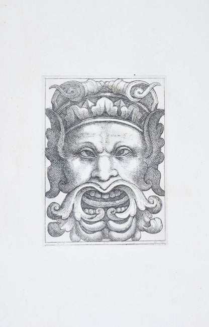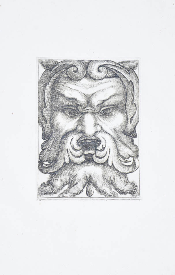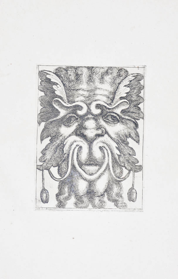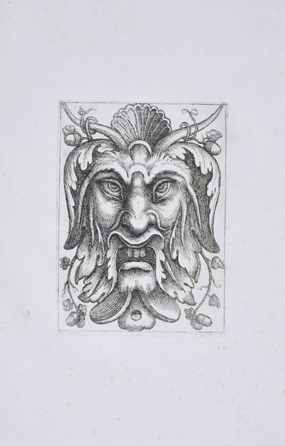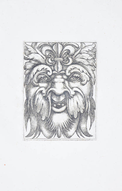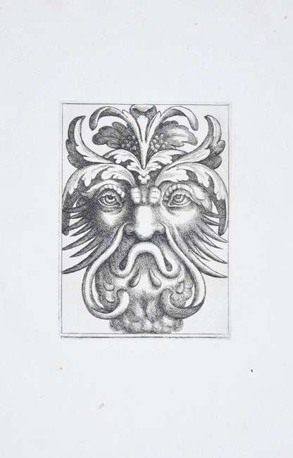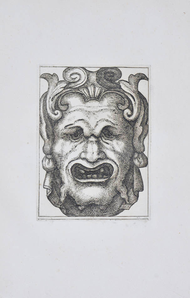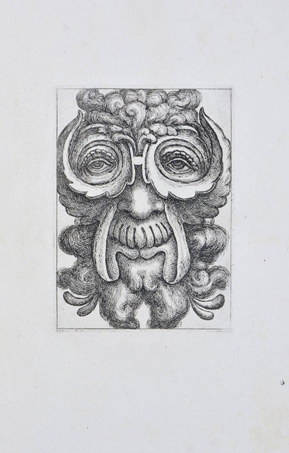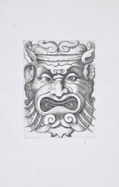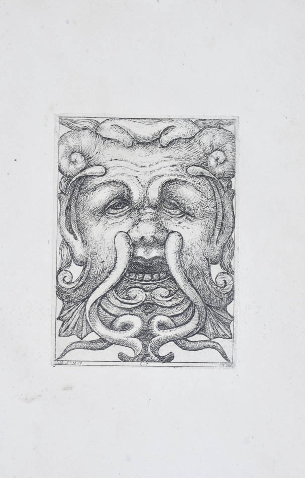 Rare. Strong impressions of etchings of grotesque masks, after original designs by the Italian (Rome) artist and engraver Aloisio Giovannoli (1550-1618). The publisher claims that the masks were inspired by antiquity but a more likely source of inspiration is the work of Giulio Romano (Pouncey & Gere, Italian Drawings in the British Museum, Raphael and his circle, London 1962, plates 94, 113) and others including the French Renaissance artist René Boyvin (ca. 1525-1598).