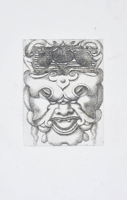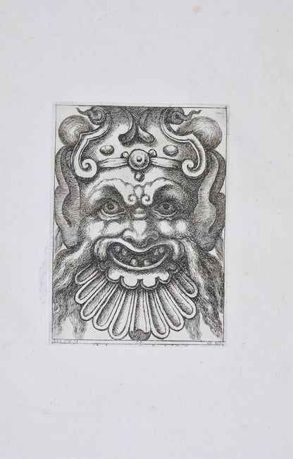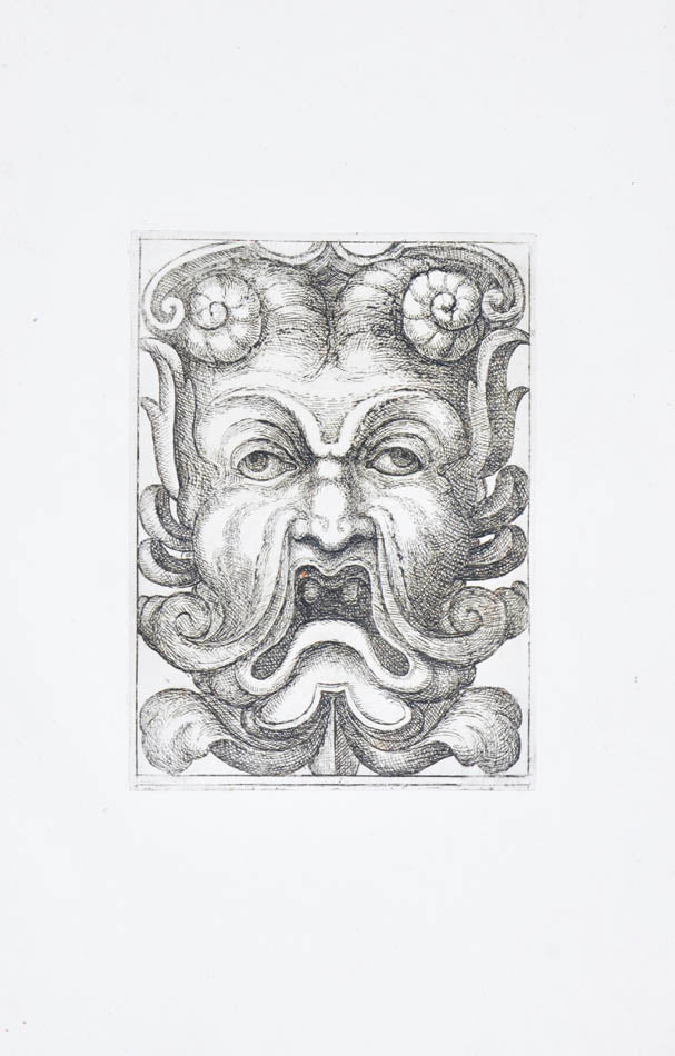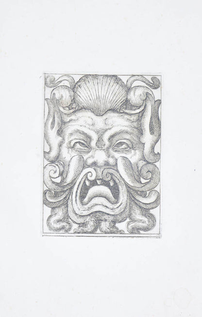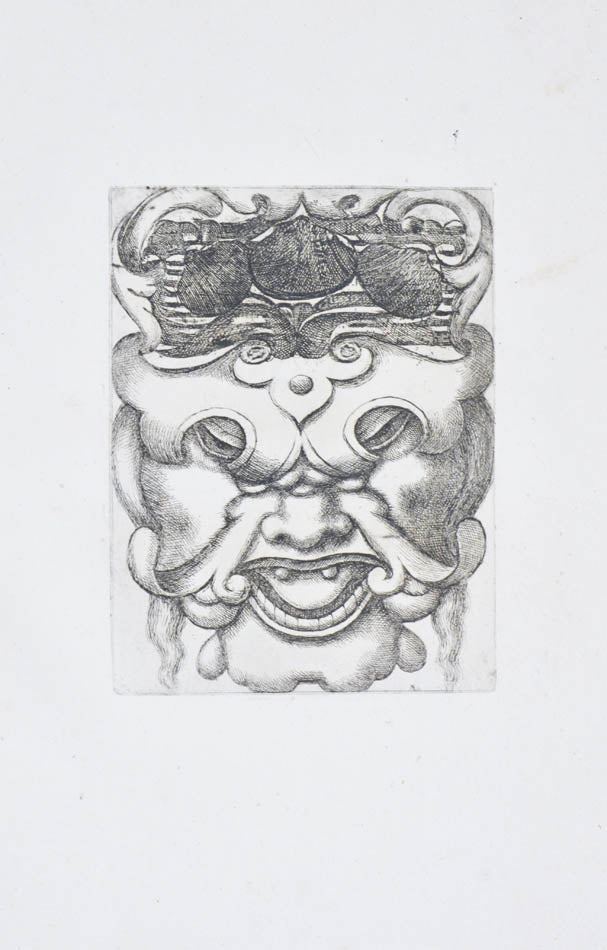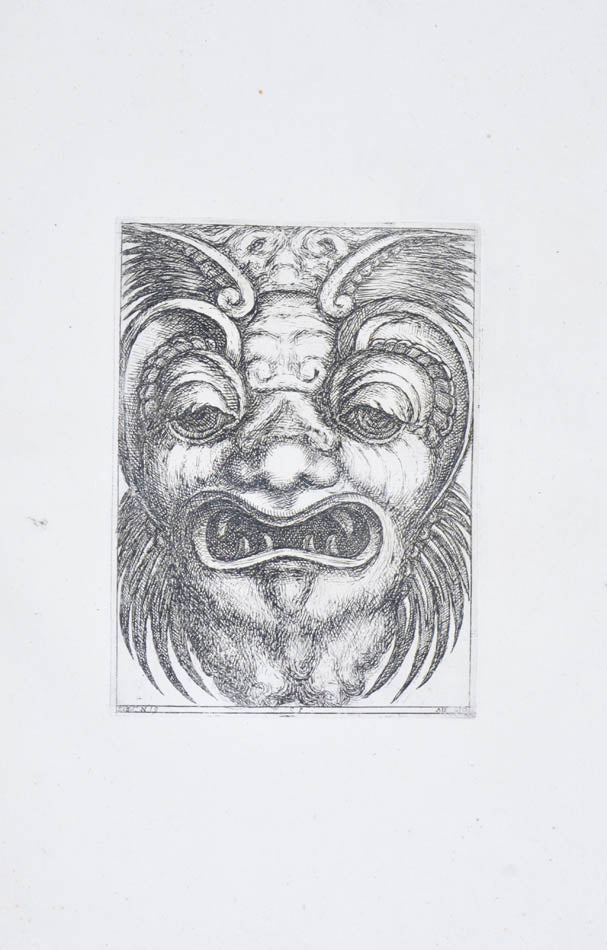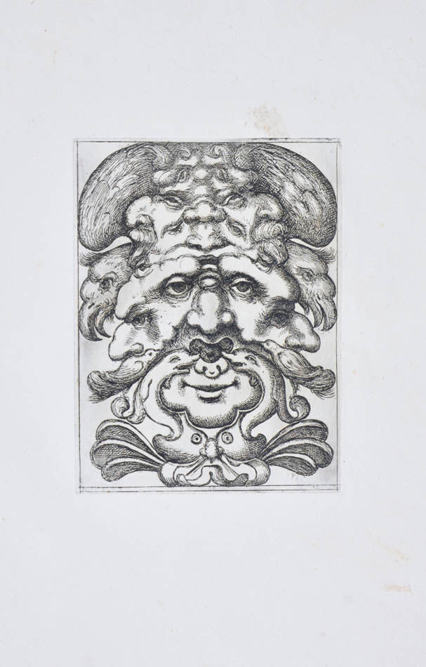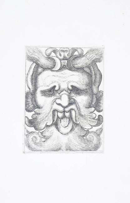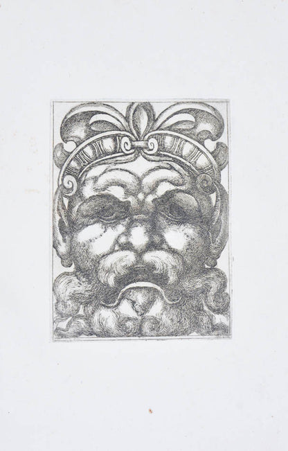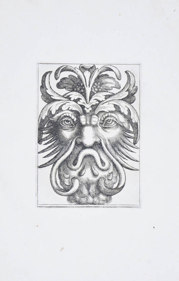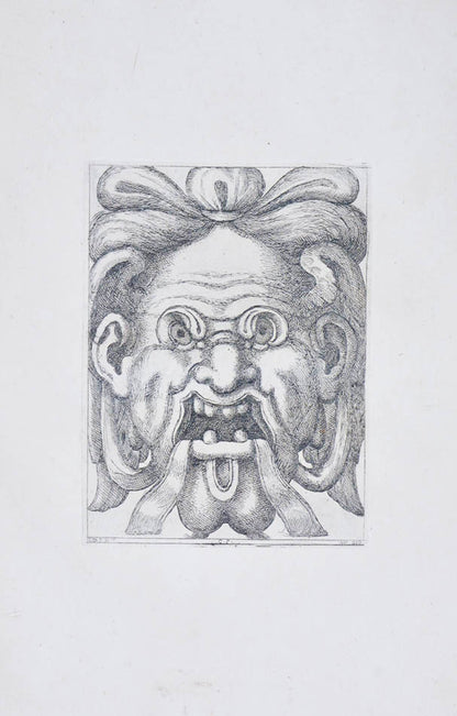 Rare. Strong impressions of etchings of grotesque masks, after original designs by the Italian (Rome) artist and engraver Aloisio Giovannoli (1550-1618). The publisher claims that the masks were inspired by antiquity but a more likely source of inspiration is the work of Giulio Romano (Pouncey & Gere, Italian Drawings in the British Museum, Raphael and his circle, London 1962, plates 94, 113) and others including the French Renaissance artist René Boyvin (ca. 1525-1598).