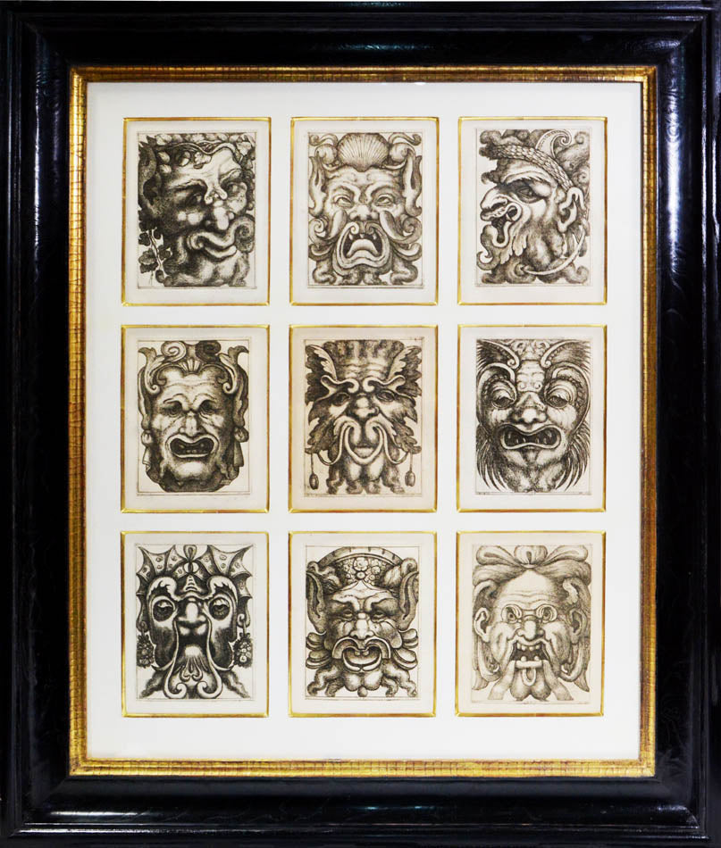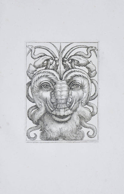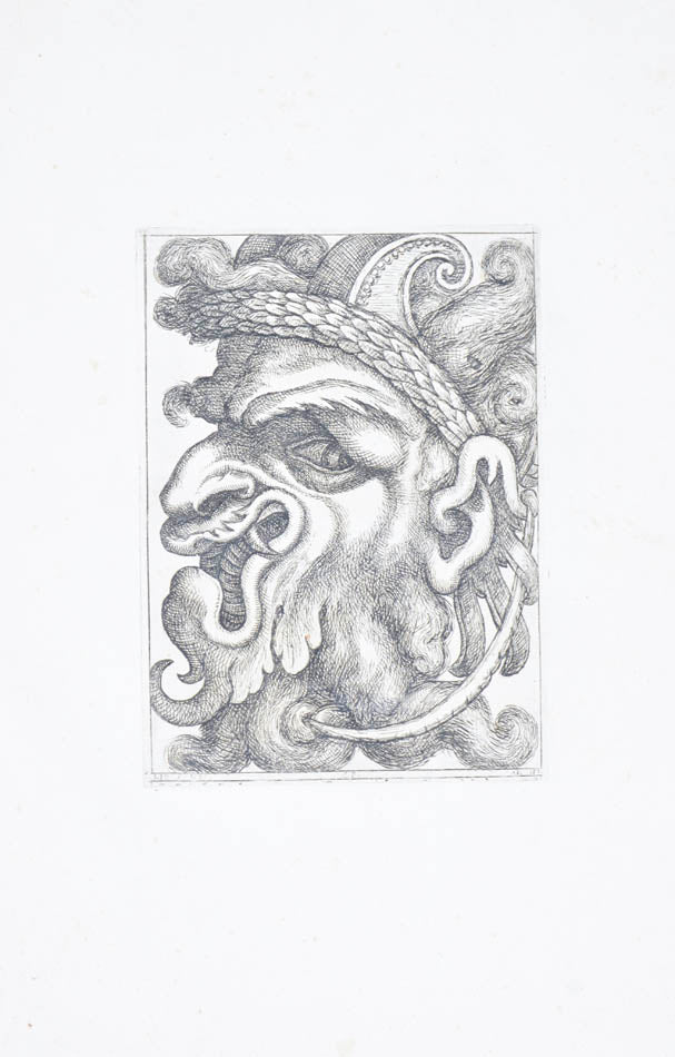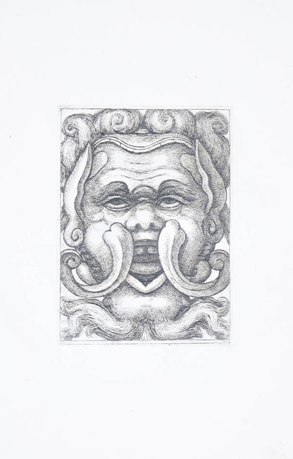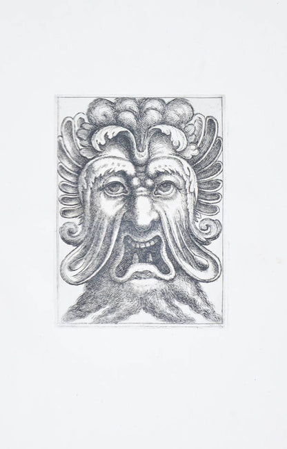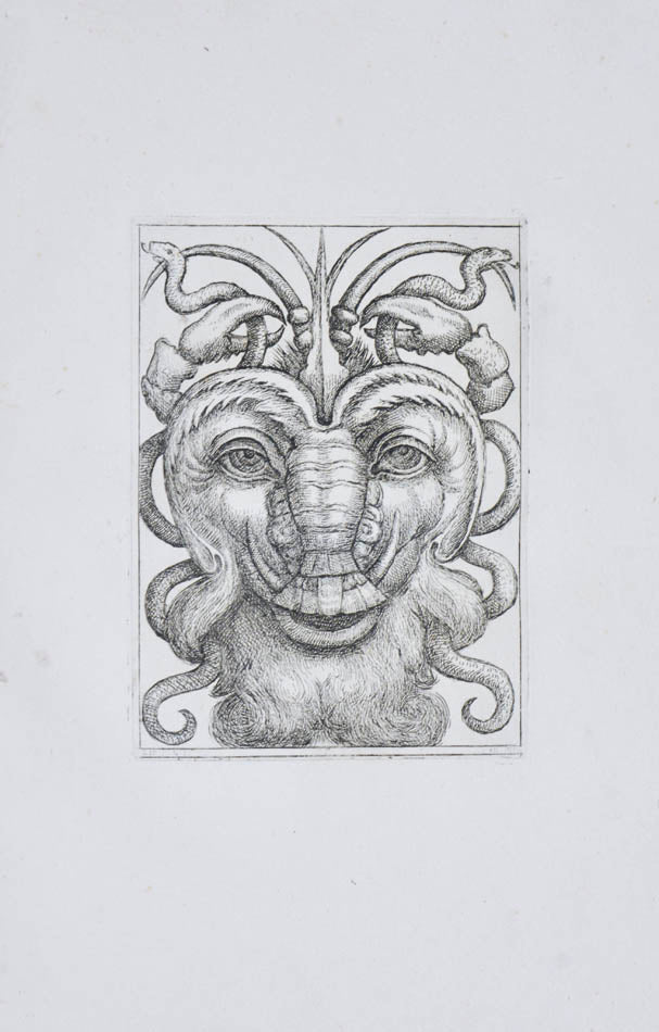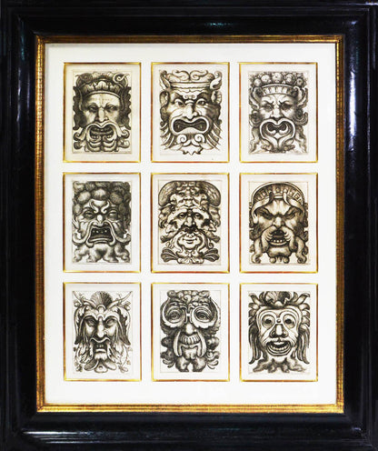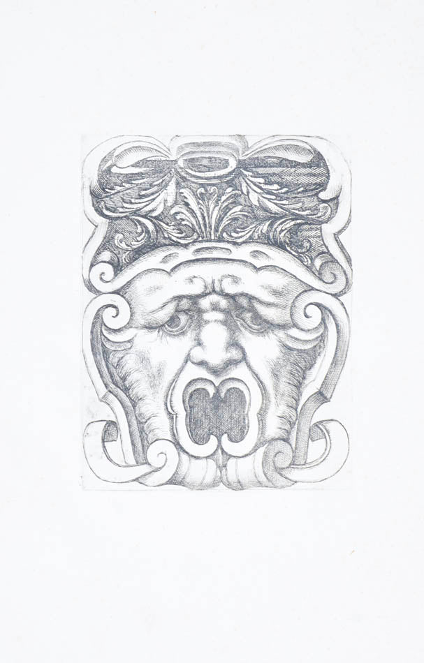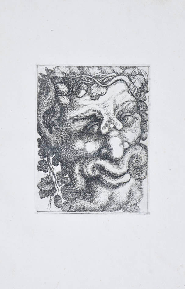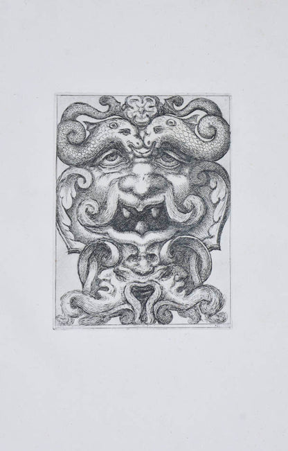 Rare. Strong impressions of etchings of grotesque masks, after original designs by the Italian (Rome) artist and engraver Aloisio Giovannoli (1550-1618). The publisher claims that the masks were inspired by antiquity but a more likely source of inspiration is the work of Giulio Romano (Pouncey & Gere, Italian Drawings in the British Museum, Raphael and his circle, London 1962, plates 94, 113) and others including the French Renaissance artist René Boyvin (ca. 1525-1598).