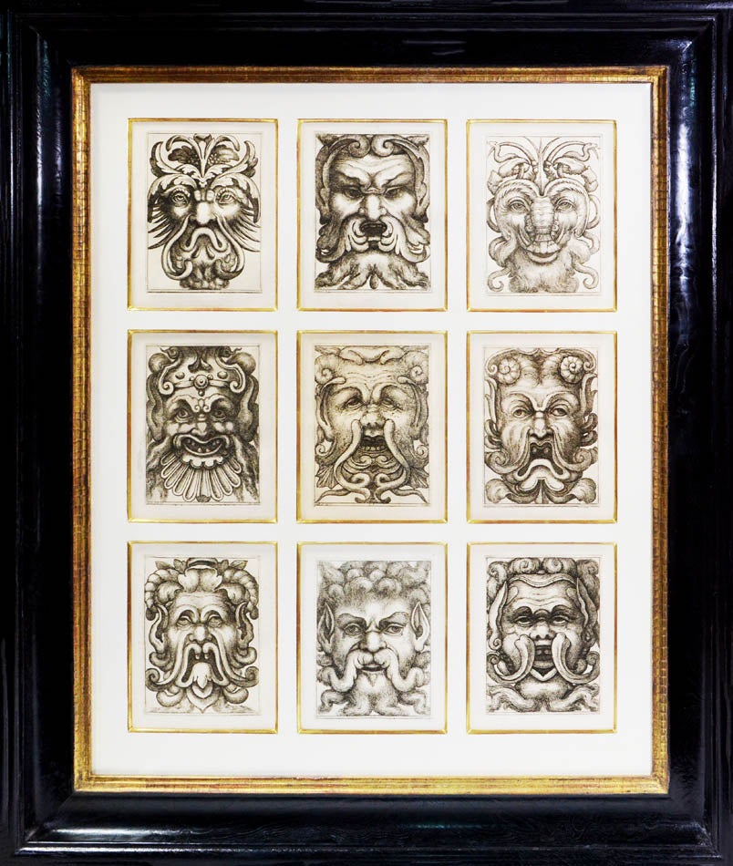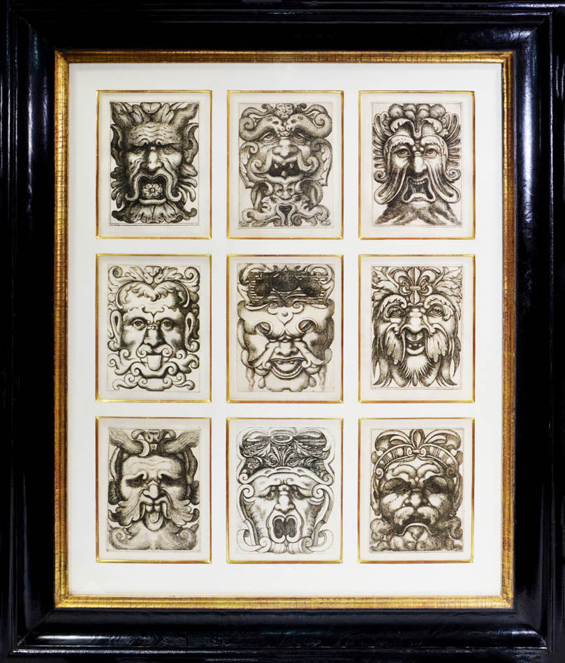 4 Groups of 9 plates of Grotesque Masks. Framed and glazed, overall dimensions: 69.3cm by 82cm.