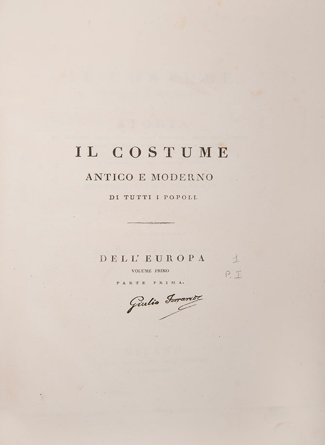 o storia del governo, della milizia, della religione, delle arti, scienze ed usanze di tutti i popoli antichi e moderni privata coi monumenti dell' antichita e representata cogli analoghi disegni... [with] Del Costume antico e moderno di tutti i popoli del Dottore Giulio Ferrario. Indice generale per alfabeto e per materie preceduto da un saggio di supplimento alla detta opera e dall' indicazione delle più importanti scoperte e relazioni fatte...[with] Aggiunte e rettificazioni all' opera il costume antico e moderno di tutti i popoli cogli....