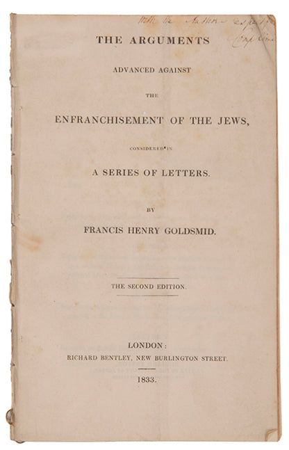 At the time, restrictive Christian oaths of allegiance effectively barred unconverted Jews from holding political office or voting in Parliamentary elections. Goldsmid, the son of the noted reformer Sir Isaac Lyon Goldsmid (1778-1859), emerged in the 1830s as the leading voice in the movement for Jewish emancipation. In 1833 he became the first professing Jew to be called to the bar (for Lincoln's Inn), and his tireless campaigning for equal rights under the law received a significant victory in 1858 when Lionel de Rothschild became the first non-Christian to take his seat in the House of Commons, swearing a modified oath on the Old Testament. Goldsmid joined Rothschild in the House in 1860 as member for Reading, a seat he would hold until his death eighteen years later.