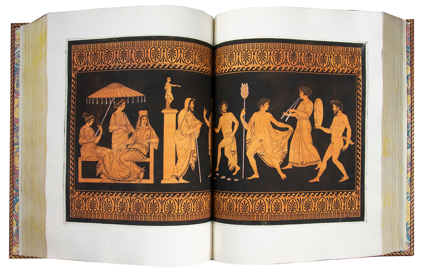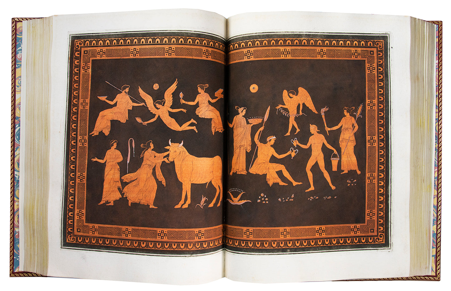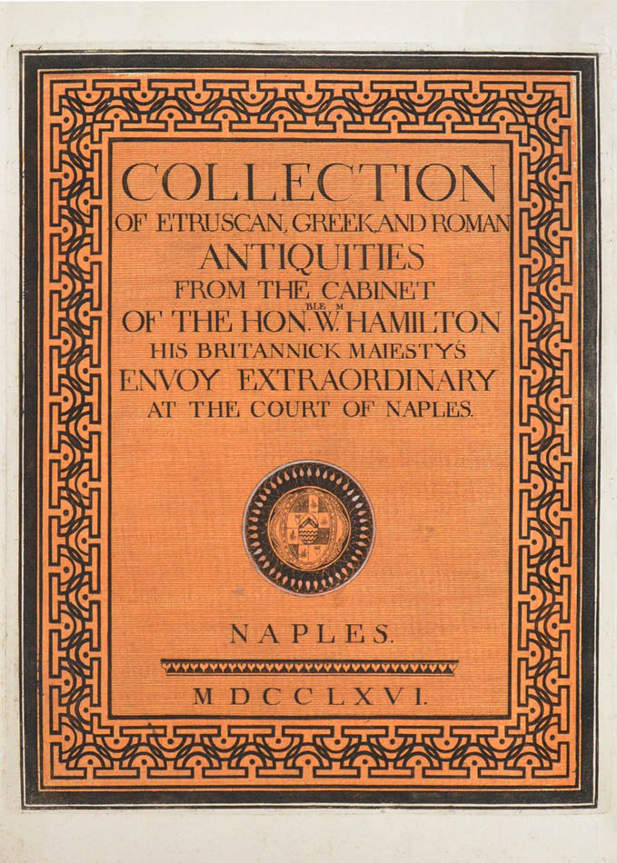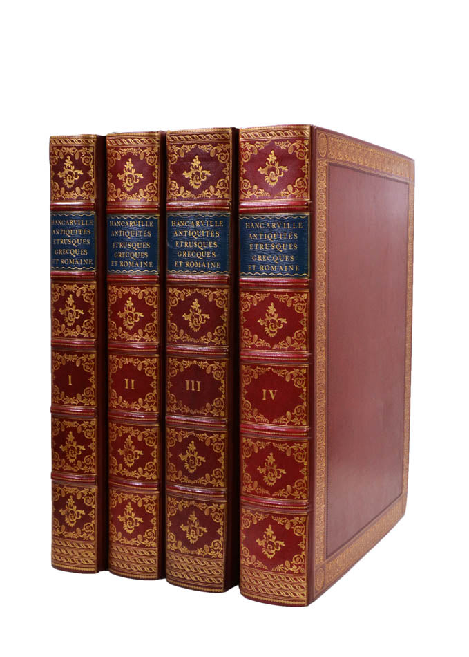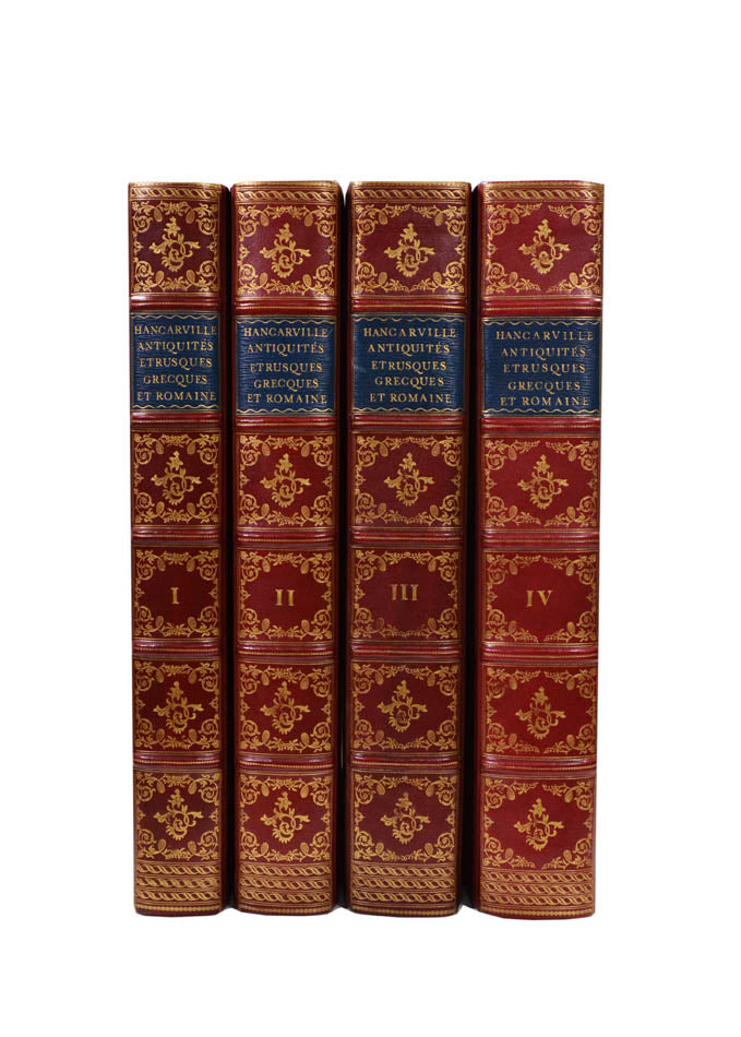 The collection was assembled by Hamilton after his appointment to the court of Naples in 1764. Pierre François Hugues, an authority on ancient art, had introduced Hamilton to the Porcinari family, the owners of a large collection of ancient classical vases which Hamilton bought and enlarged, and then sold to the British Museum in 1772. Before their shipment of England, all the objects were listed, drawn and described under the supervision of the brilliant but unscrupulous 'baron' The work was finely illustrated with hand-coloured engraved plates whose 'influence on neo-classical design and taste was to be profound' (Dictionary of Art). One of the explicit aims of the work was to discover the proportions of ancient vases in order to aid in their true reproduction, and indeed its influence on Josiah Wedgewood was significant. With the first two volumes issued, publication was then interrupted by Hugues' expulsion from Naples, apparently for debt, and Hamilton had to overcome the difficulty of finding his copper-plates in the hands of creditors. The last two volumes did not appear before 1776. Although Blackmer states that the edition was of 500 copies, it appears that only 100 copies of the two later volumes were issued (cf. I. Jenkins and K. Sloan Vases and Volcanoes, 1996, p. 49), and this, together with the long gap in publication, accounts for the relatively high number of incomplete set