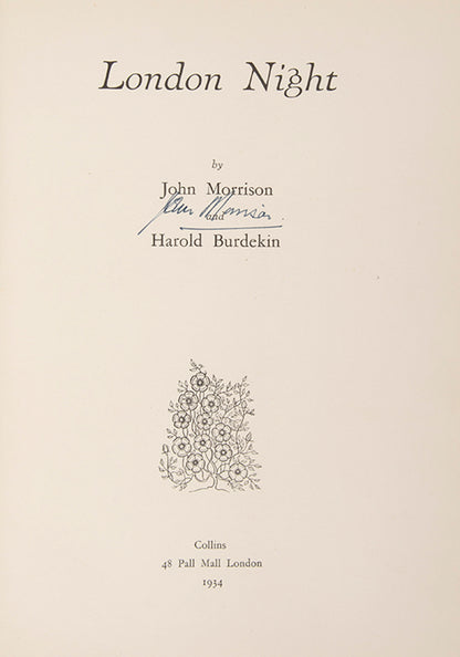 Presentation copy of this collaboration between Harold Burdekin and John Morrison, who assisted him in making the photographs. In his introduction, Morrison writes, 'Night, M. Paul Morand has remarked with Gallic shrewdness, is not the negative of day,' a reference to Brassaï's Paris de Nuit (1932), which influenced several similar publications, including the present work and Bill Brandt's A Night in London (1938).