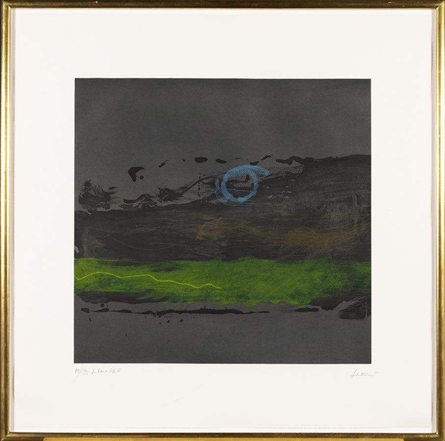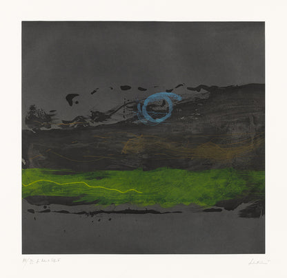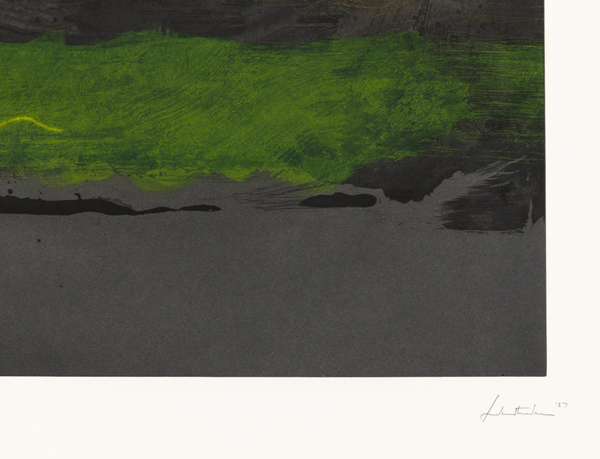 Helen Frankenthaler, an integral member of the second wave of Abstract Expressionists, was a trailblazer of the modern print-making movement, endlessly pushing and transcending boundaries through relentless experimentation. Born and raised in New York City, Frankenthaler titles this work 'Broome Street', which is a road in Lower Manhattan that stretches nearly the full width of the island. Through etching, aquatint and drypoint, the artist creates a dark and moody abstract landscape with electric green lines running across, capturing the feel of this dynamic, fast-paced Manhattan street at night.