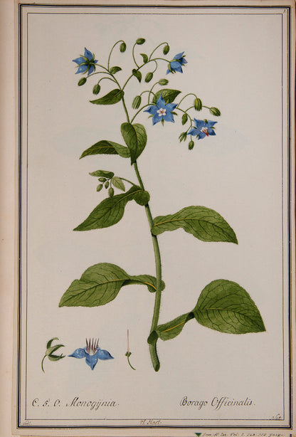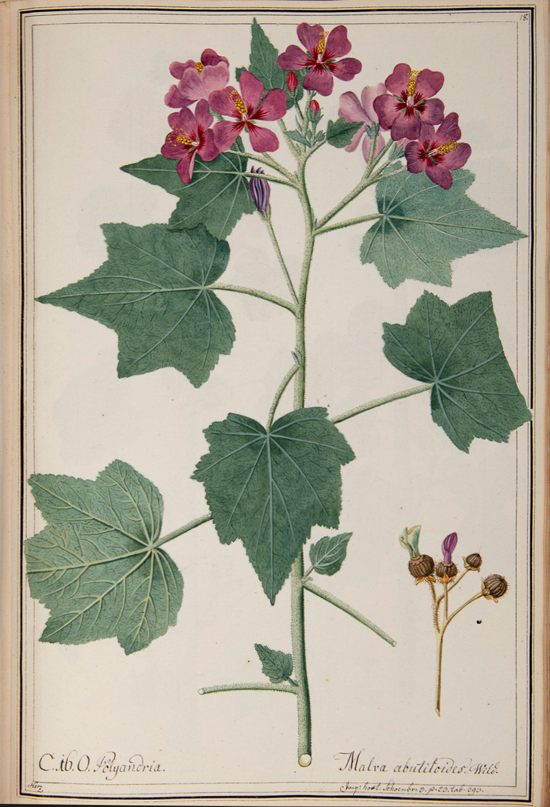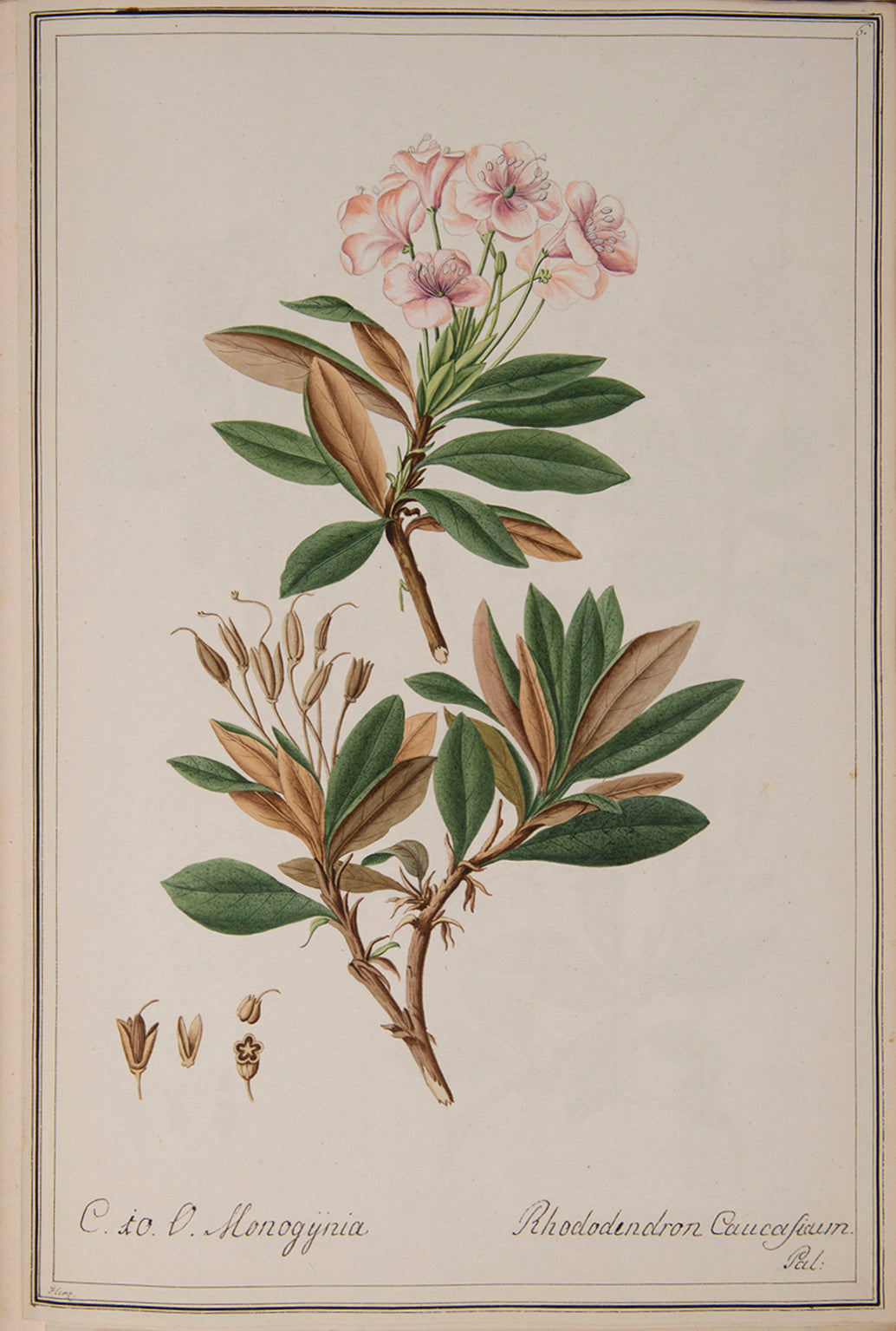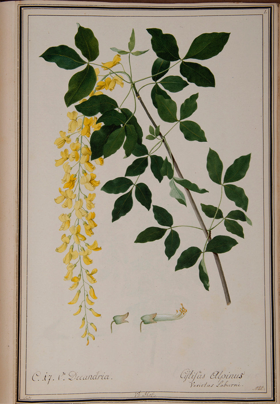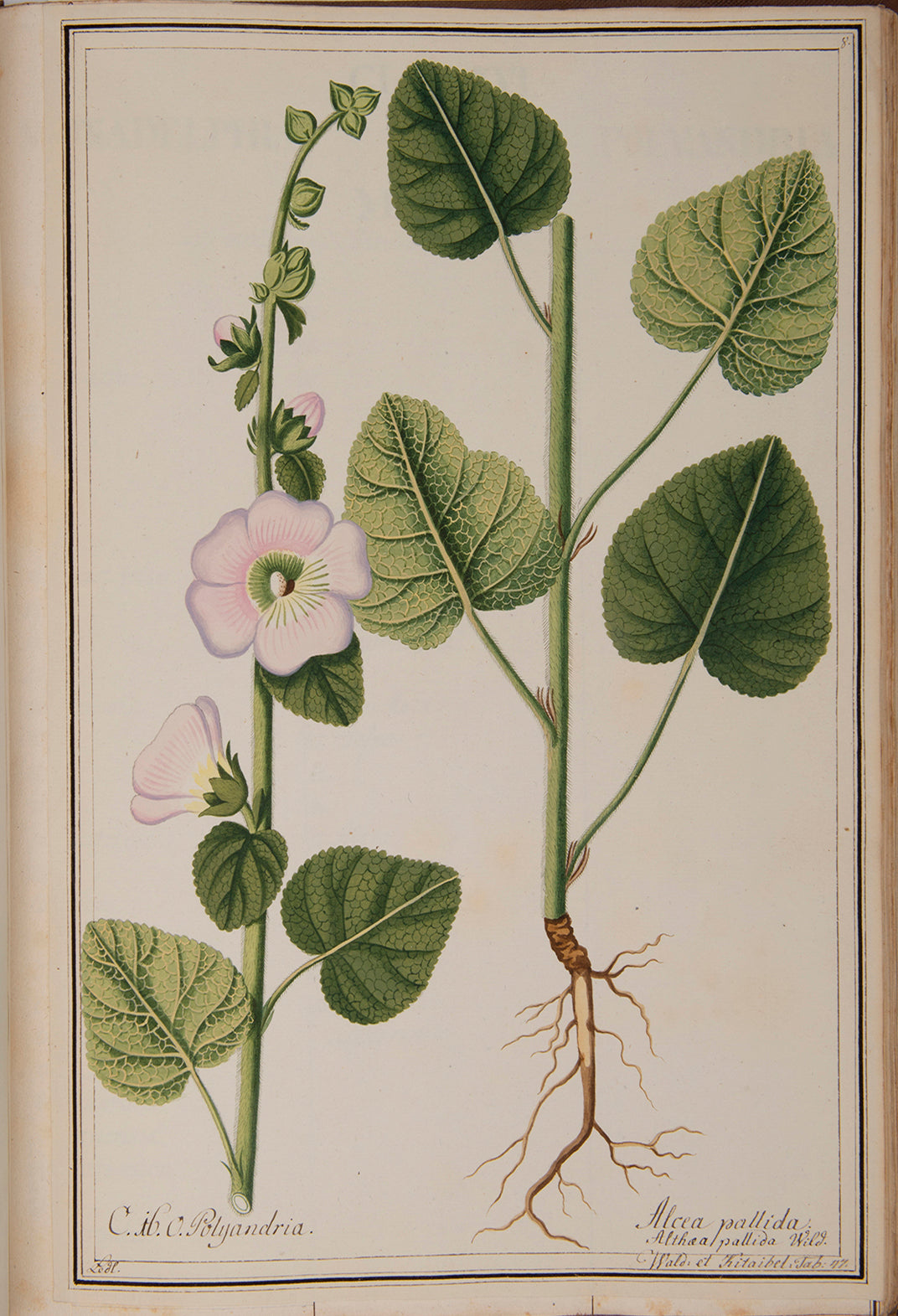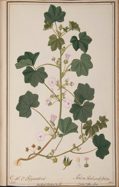 The bulk of the plates are taken from Jacquin's numerous works, in particular Icones plantarum rariores (1781-1793), Florae Austriacae (1773-1778) and Plantarum rariorum Horti Caesarei Schoenbrunnensis (1797-1804), along with Aiton's Hortus Kewensis (1789), Curtis's Botanical Magazine and Flora Londinensis, Oeder's Flora Danica, Scopoli's Deliciae florae et faunae insubricae (1786) and Cavanilles's Monadelphiae classis dissertationes decem (1790). Other significant botanical works are also mentioned, including Besler's Hortus Eystettensis, Rheede tot Drakenstein's Hortus Indicus Malabaricus, Roxburgh and Banks's works on the plants of Coromandel, Waldstein and Kitaibel's Descriptiones et icones plantarum rariorum Hungariae (1802-1812), and Pallas's Flora Rossica.
