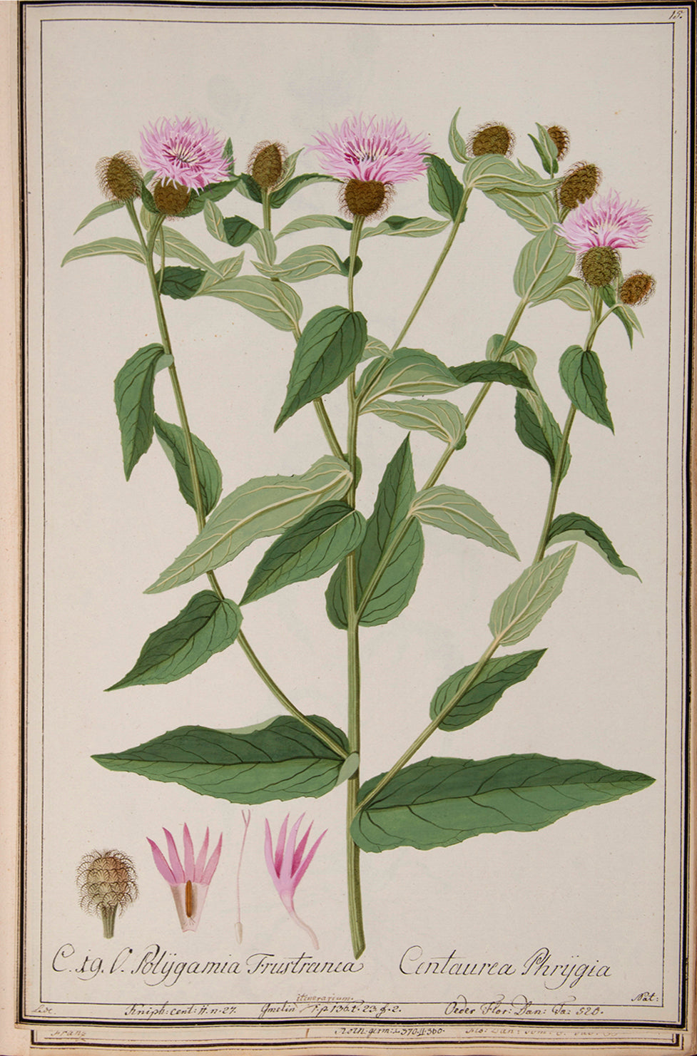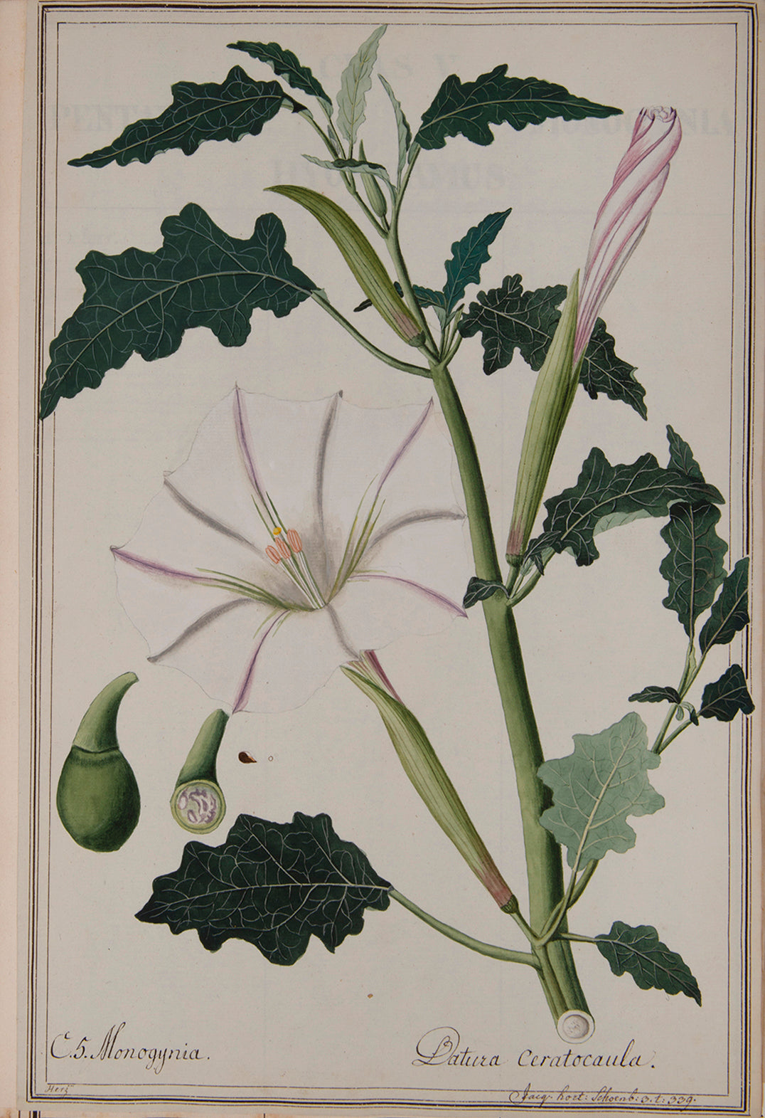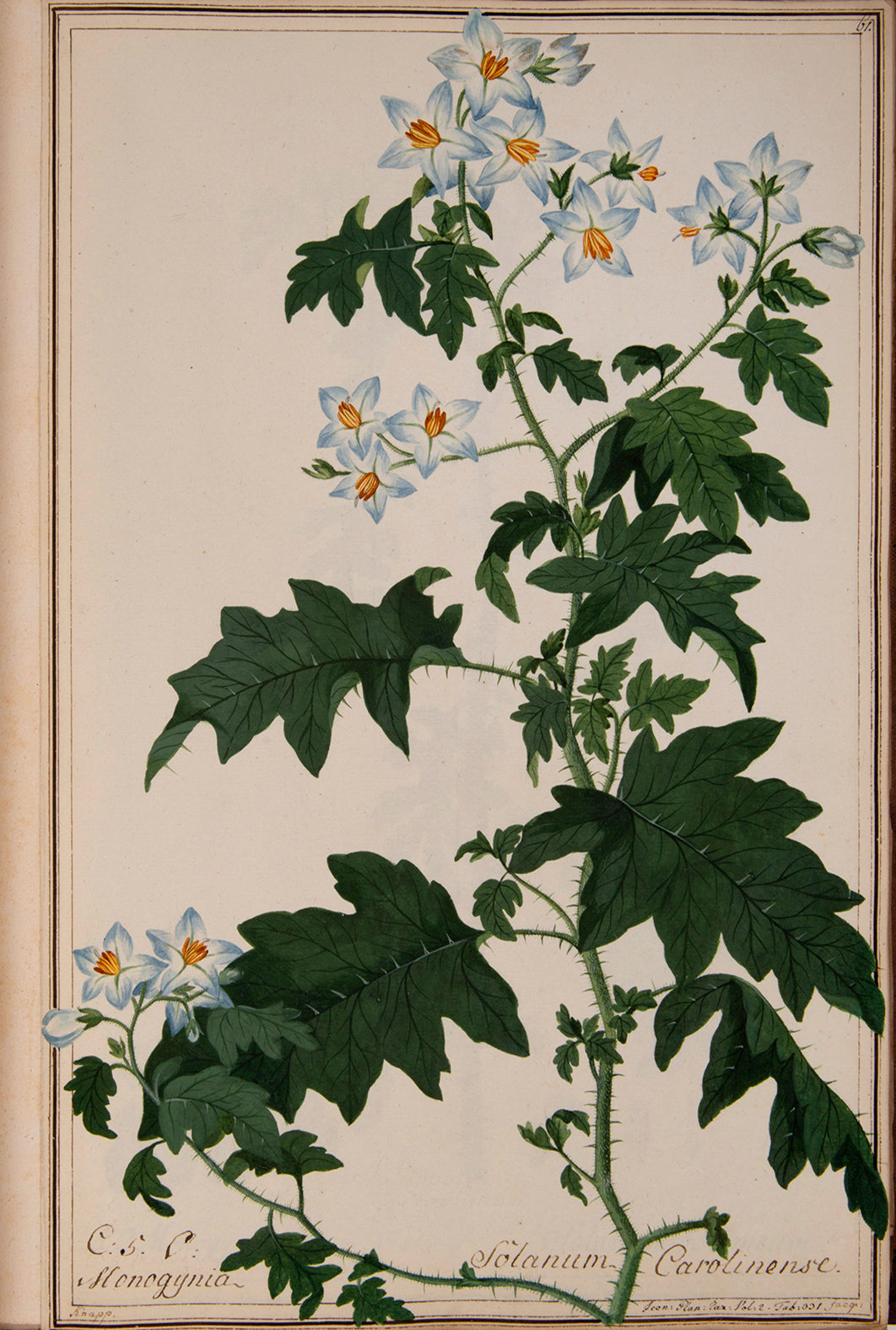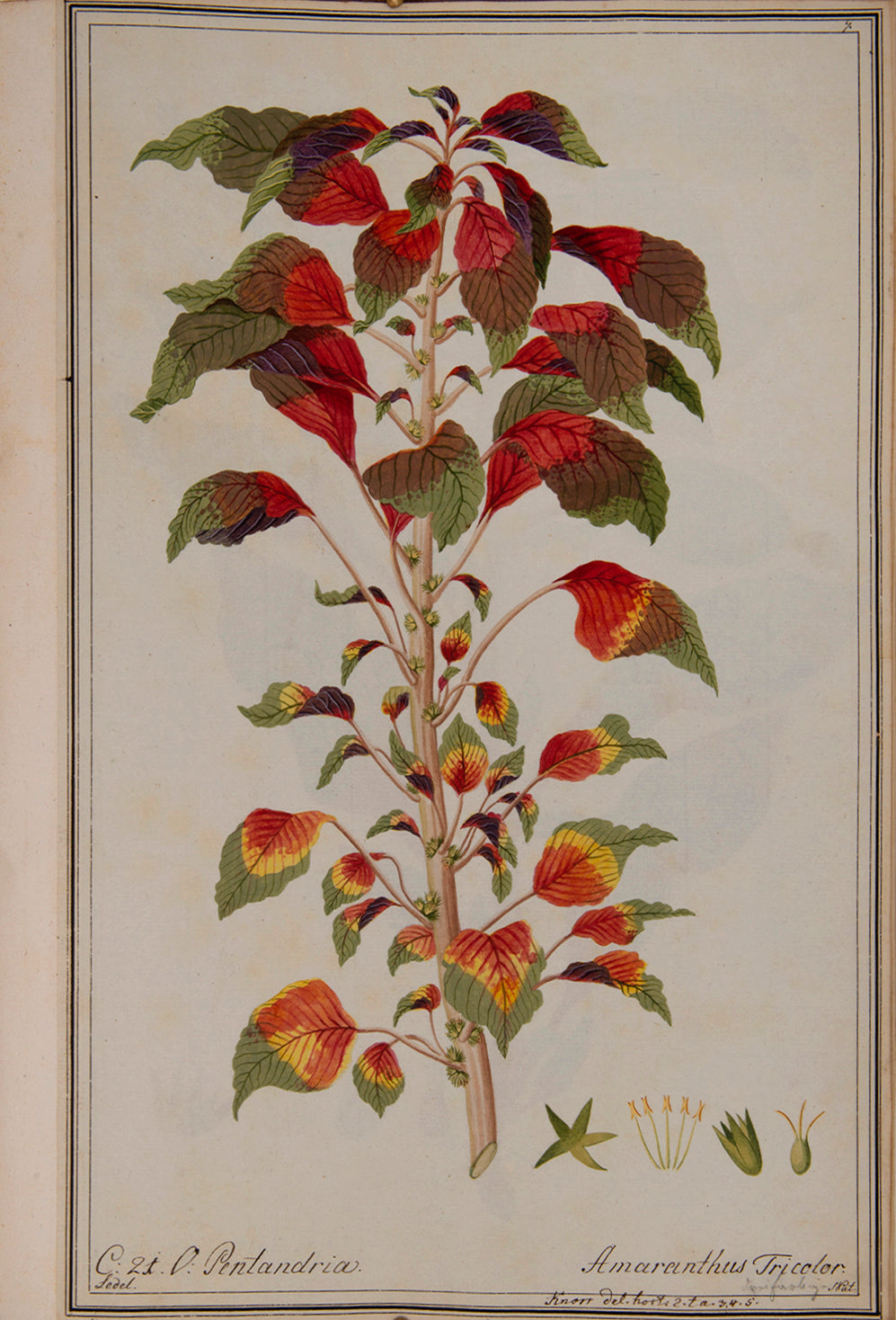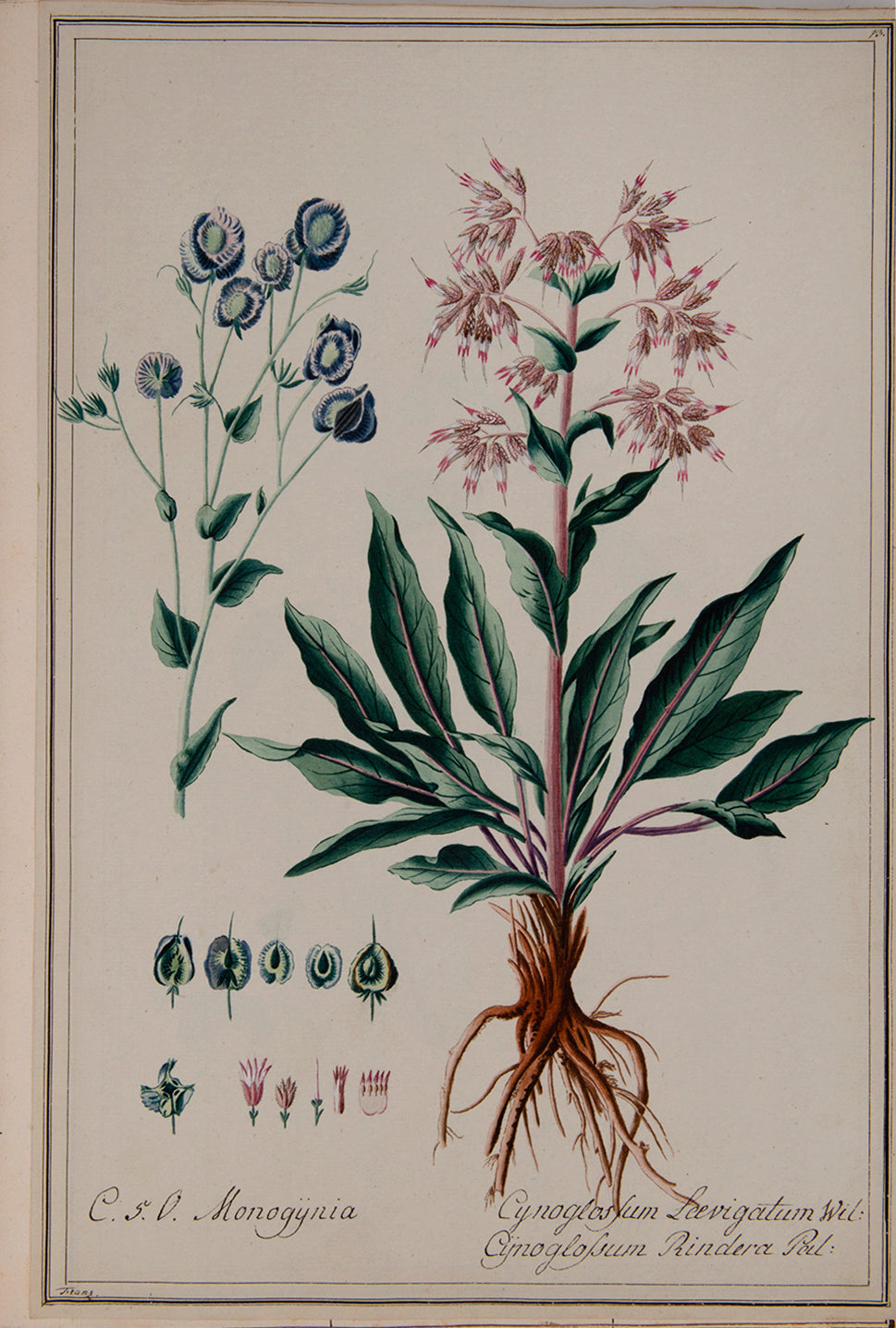 The bulk of the plates are taken from Jacquin's numerous works, in particular Icones plantarum rariores (1781-1793), Florae Austriacae (1773-1778) and Plantarum rariorum Horti Caesarei Schoenbrunnensis (1797-1804), along with Aiton's Hortus Kewensis (1789), Curtis's Botanical Magazine and Flora Londinensis, Oeder's Flora Danica, Scopoli's Deliciae florae et faunae insubricae (1786) and Cavanilles's Monadelphiae classis dissertationes decem (1790). Other significant botanical works are also mentioned, including Besler's Hortus Eystettensis, Rheede tot Drakenstein's Hortus Indicus Malabaricus, Roxburgh and Banks's works on the plants of Coromandel, Waldstein and Kitaibel's Descriptiones et icones plantarum rariorum Hungariae (1802-1812), and Pallas's Flora Rossica.