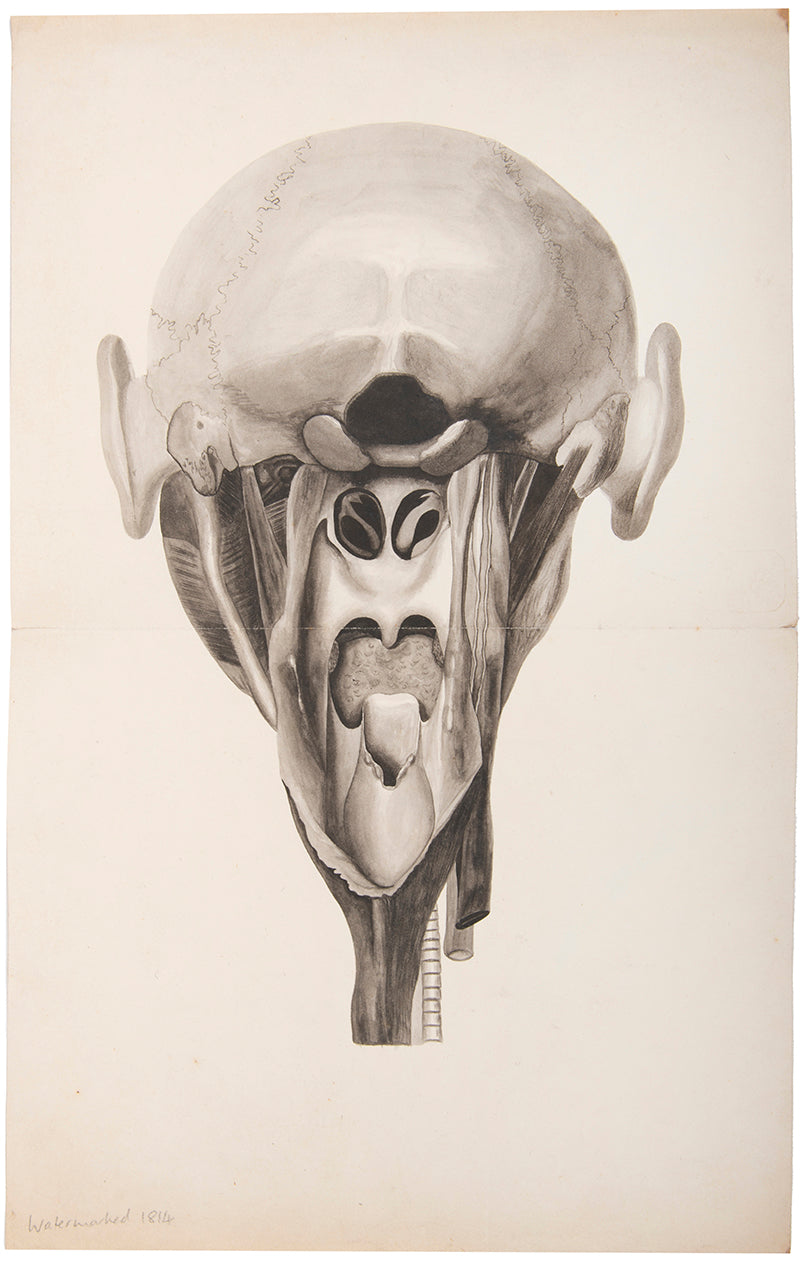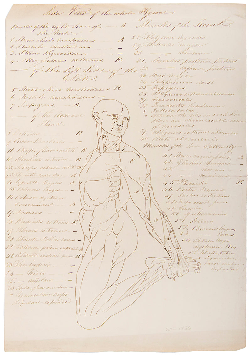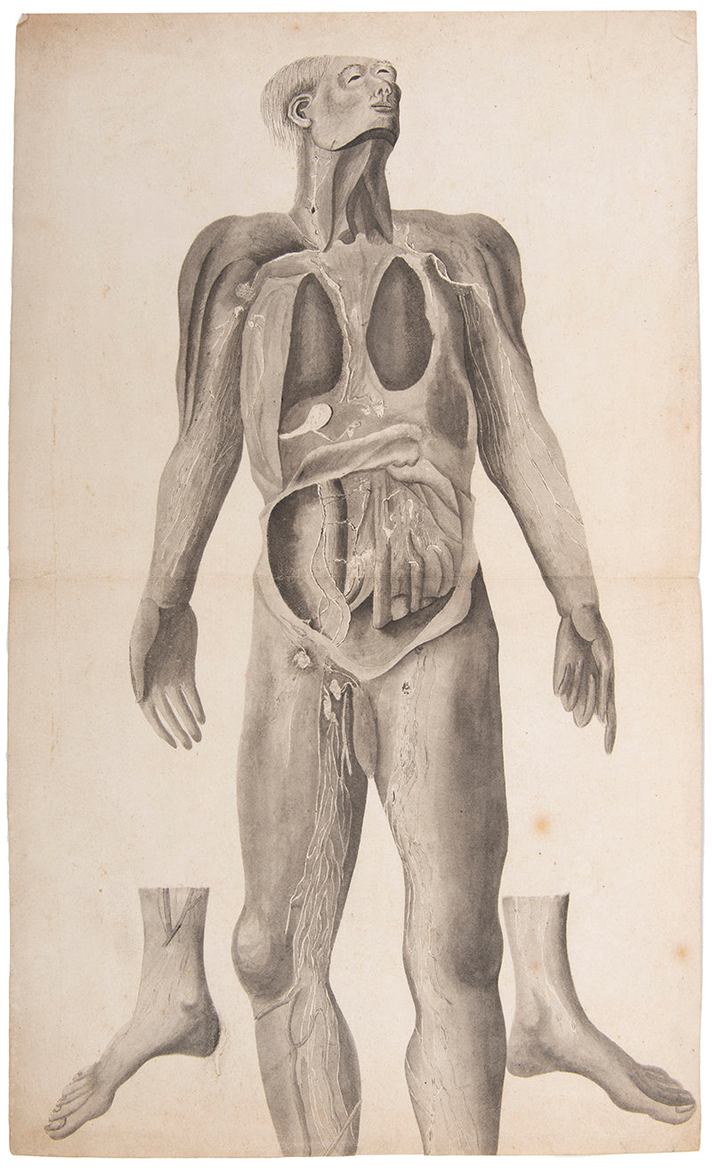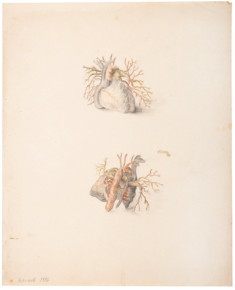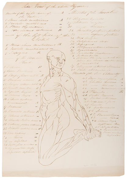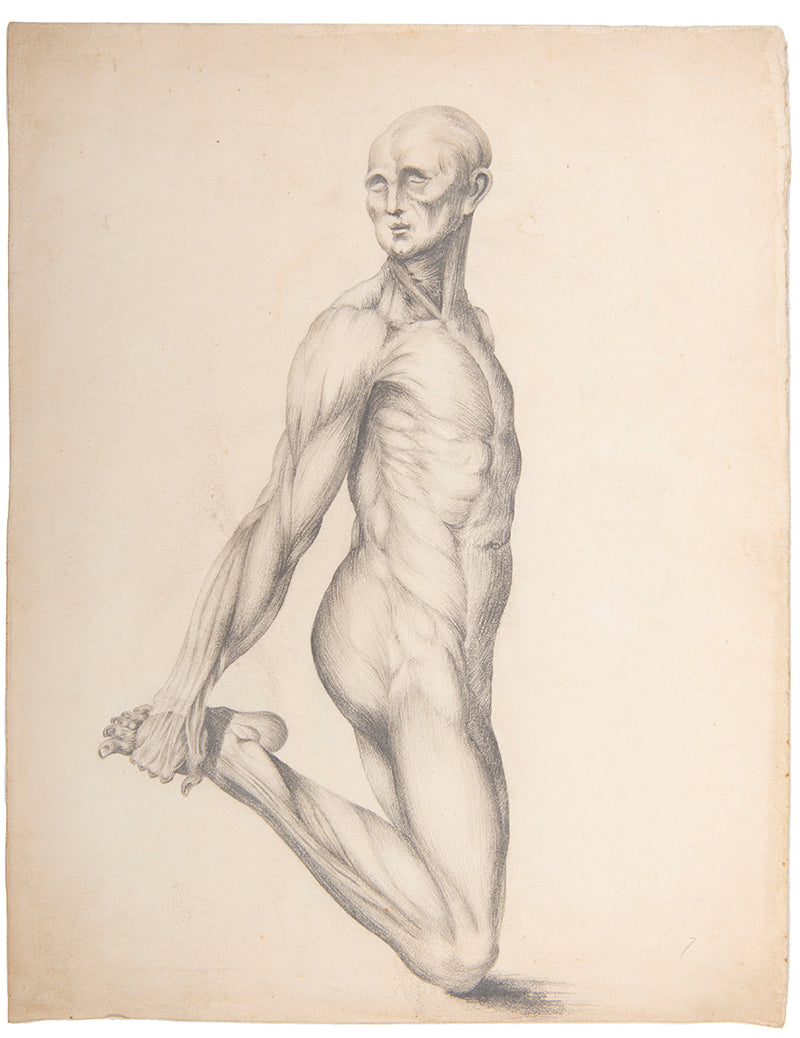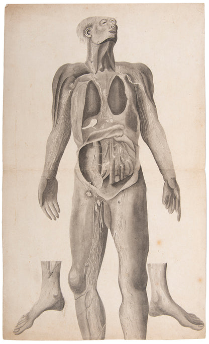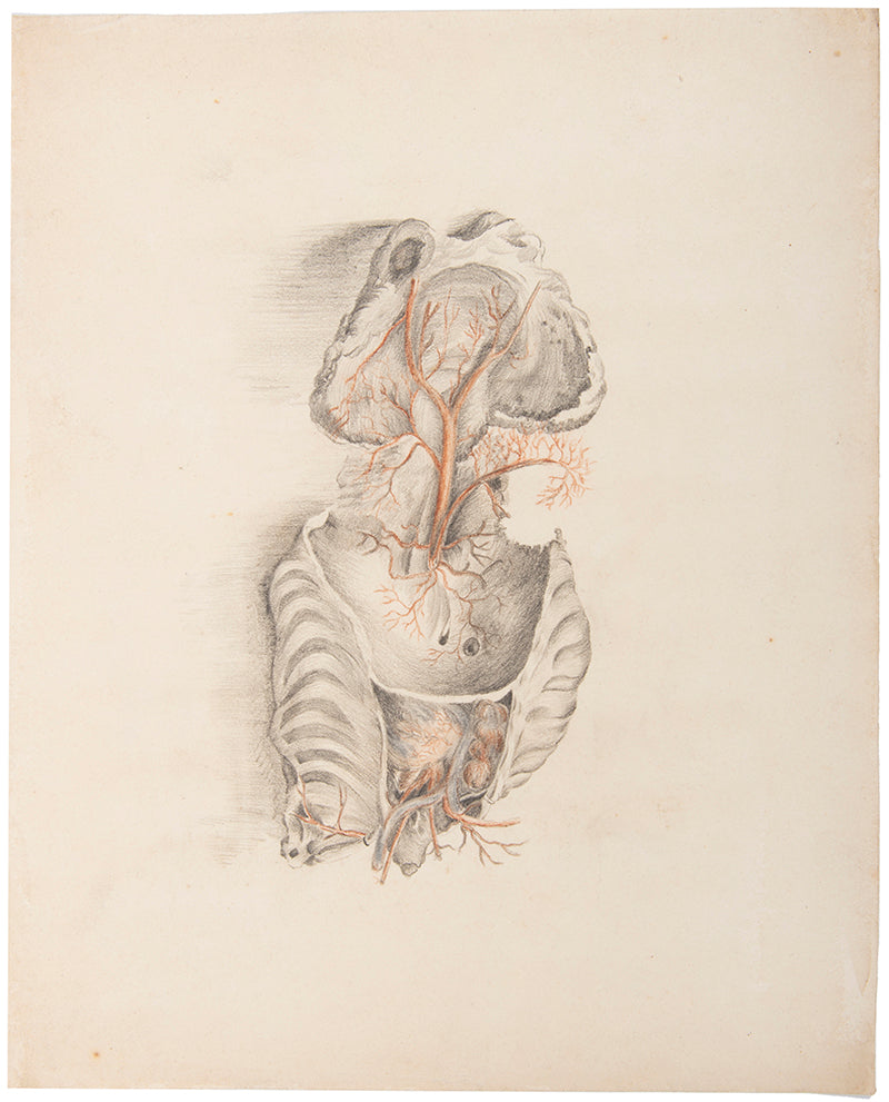 The majority of these illustrations were produced at the dissecting table, almost certainly by medical students (though artists studying anatomy could also be represented). They are in multiple hands with different levels of skill, and it is unclear if they were gathered together at the time they were made, or by a later collector. The illustrations depict cadavers in various states of dismemberment (with a few of the drawings in series), some of which have been positioned with hooks, string, or rope, and in one case an instrument propping up a foot. Individual body parts and internal organs including the heart, liver, appendix, brain, ear, and mouth, are represented, and there are also studies of organ systems such as the muscles and nerves over larger areas of the body. Two drawings depict a fracture and dislocation of the shoulder bones from different angles, one depicts what may be a venereal disease in vibrant red, and another shows examples of wound care with bandages. A small number might have been done from prepared specimens, in particular some of the images of bones. And a few could have been life drawings focusing on muscles; two of the illustrations use a statue of the god Hermes to identify muscle groups and body parts. Some of the drawings include hand-written identification keys, but most are blank and none are signed.