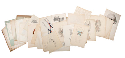 87 individual drawings on loose sheets of various paper stocks and sizes, some watermarked or with stationer's blind stamps. Mainly pencil, some pen and ink wash, a few with coloured or highlighted portions.