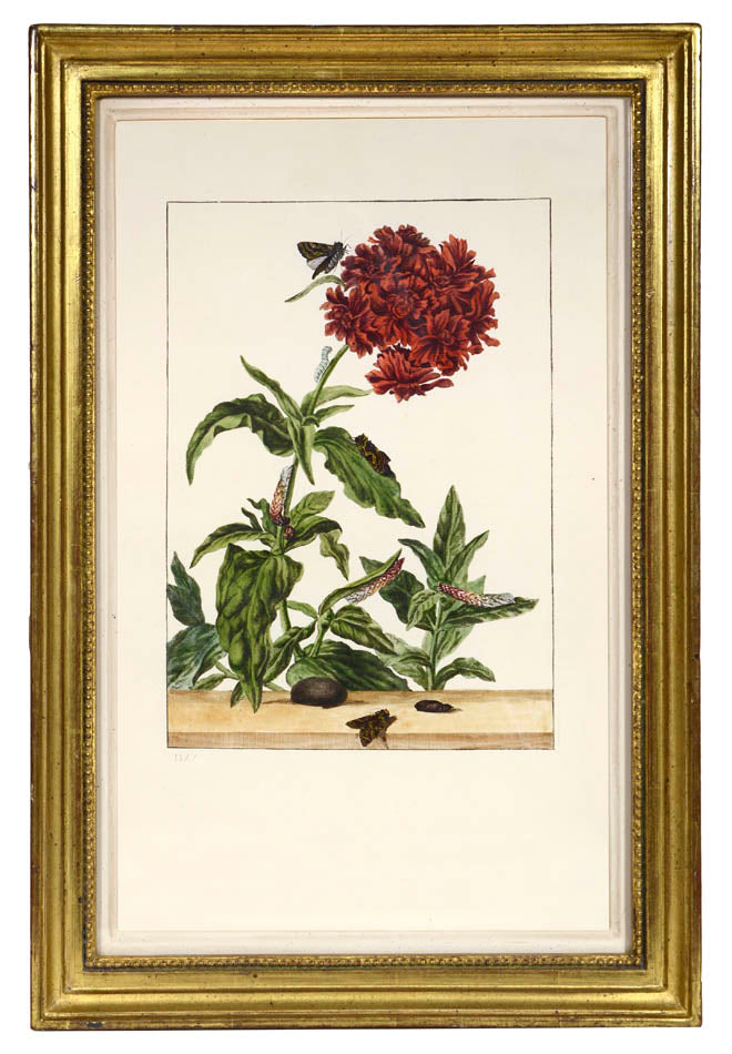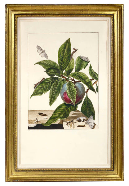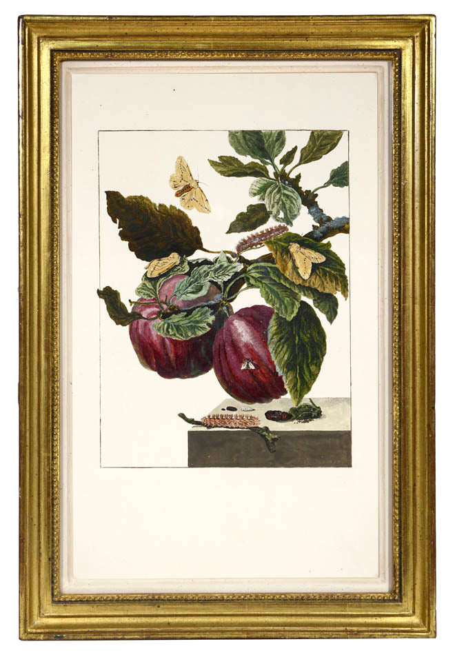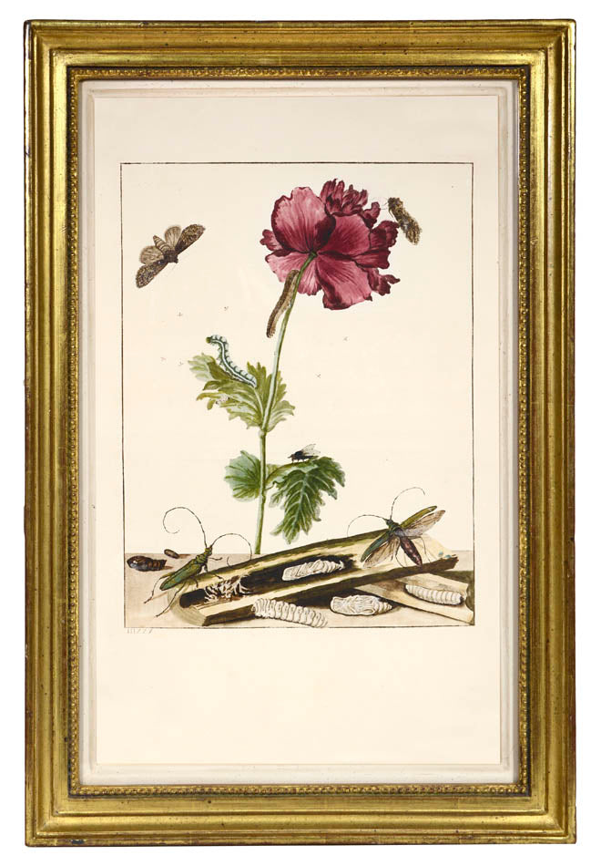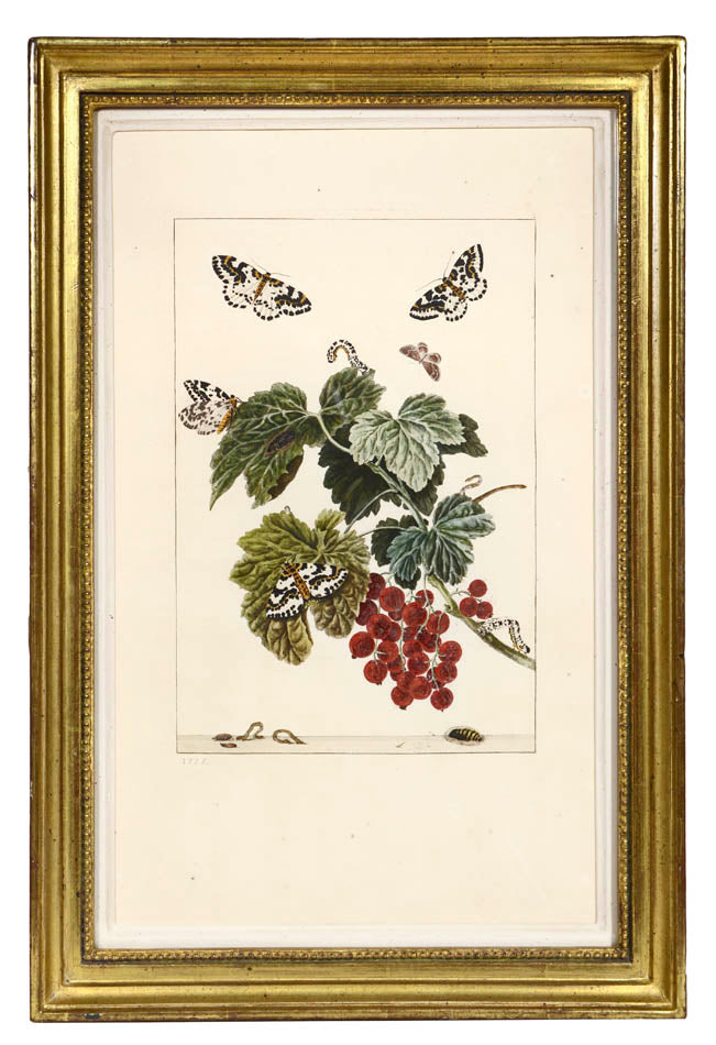 6 copper engraved plates with fine original colour, showing the metamorphosis of butterflies, moths and other flying insects. Framed and glazed, overall size: 31.6cm by 46.7cm.