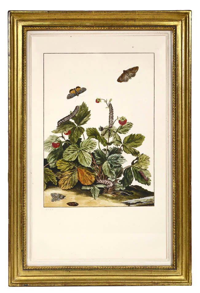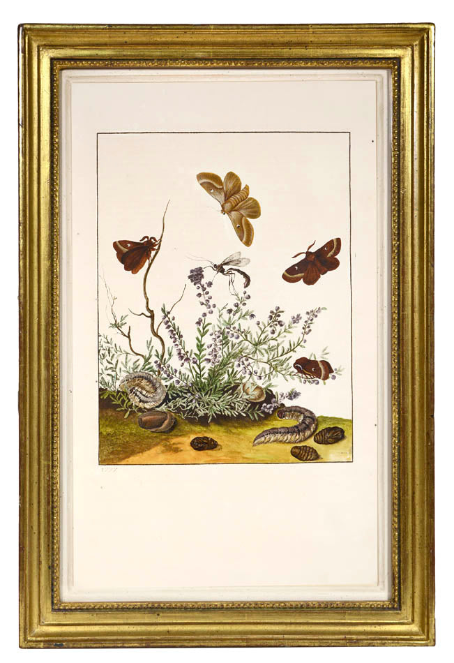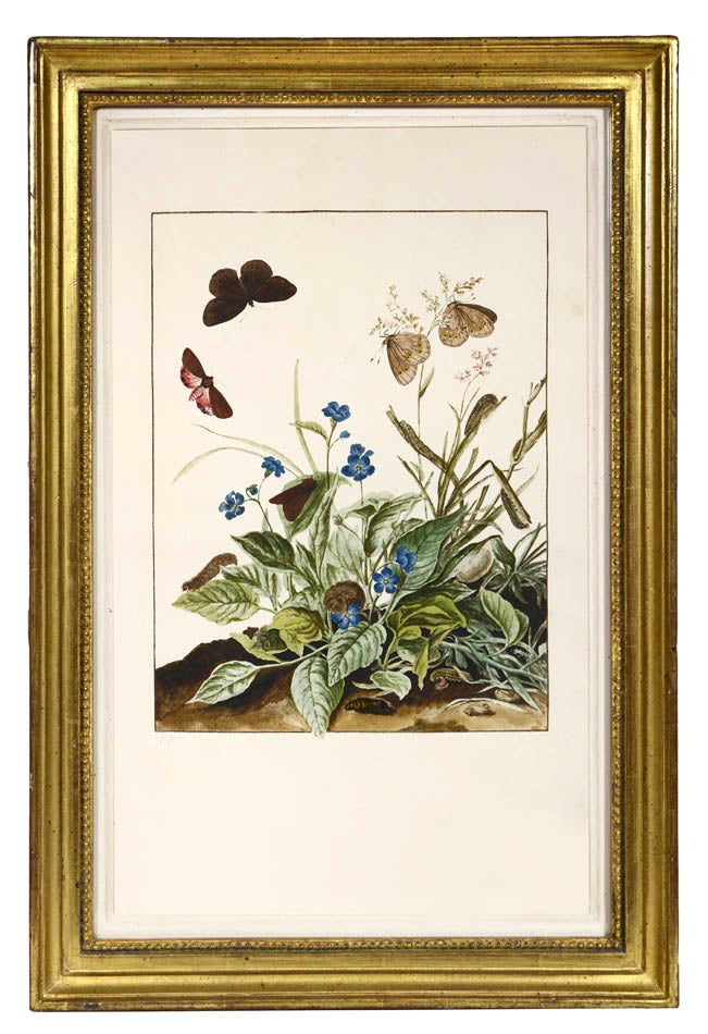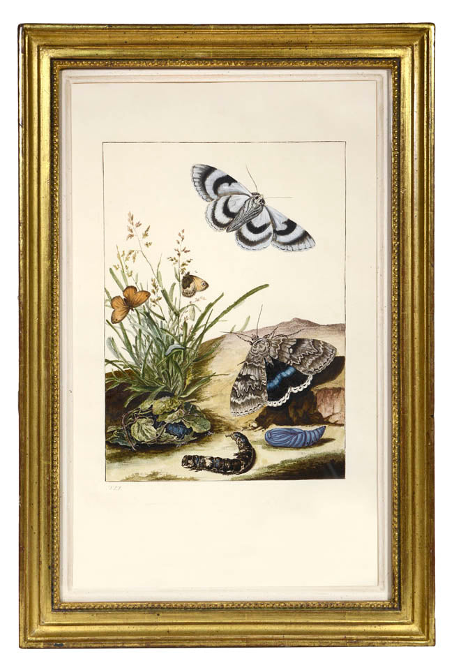 Group of six copper engravings with fine original colour, showing the metamorphosis of butterflies, moths and other flying insects. Framed and glazed, overall size: 31.6cm by 46.7cm.