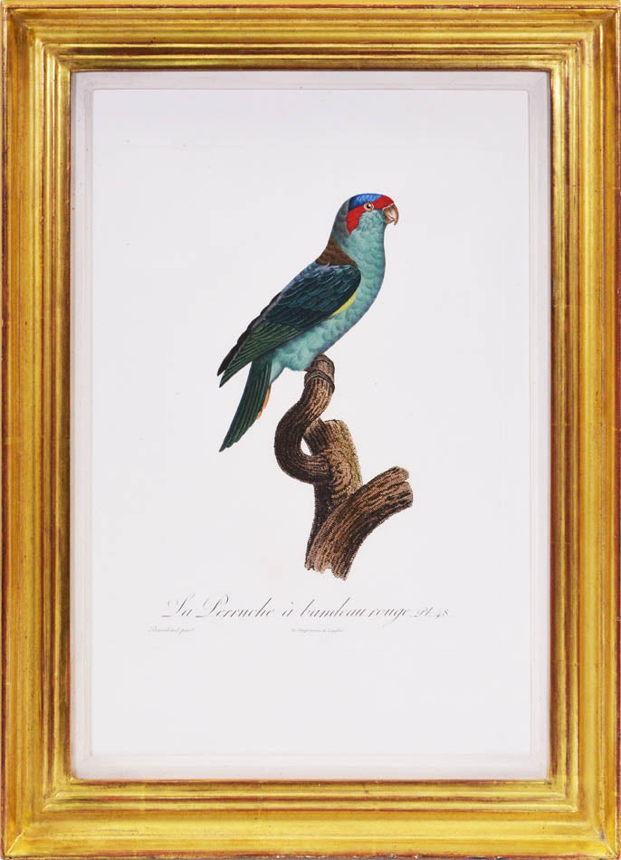 This exquisite monograph was written by Francois Levaillant, an adventurer and natural historian, who was one of the first to record sightings of Australian parrots. Barrband's skill was greatly esteemed and his name lent cachet to the sumptious work authored by Levaillant. Barraband's brilliantly colored engravings of exotic birds coupled with Levaillant's precise descriptions represent the height of realistic bird art.
