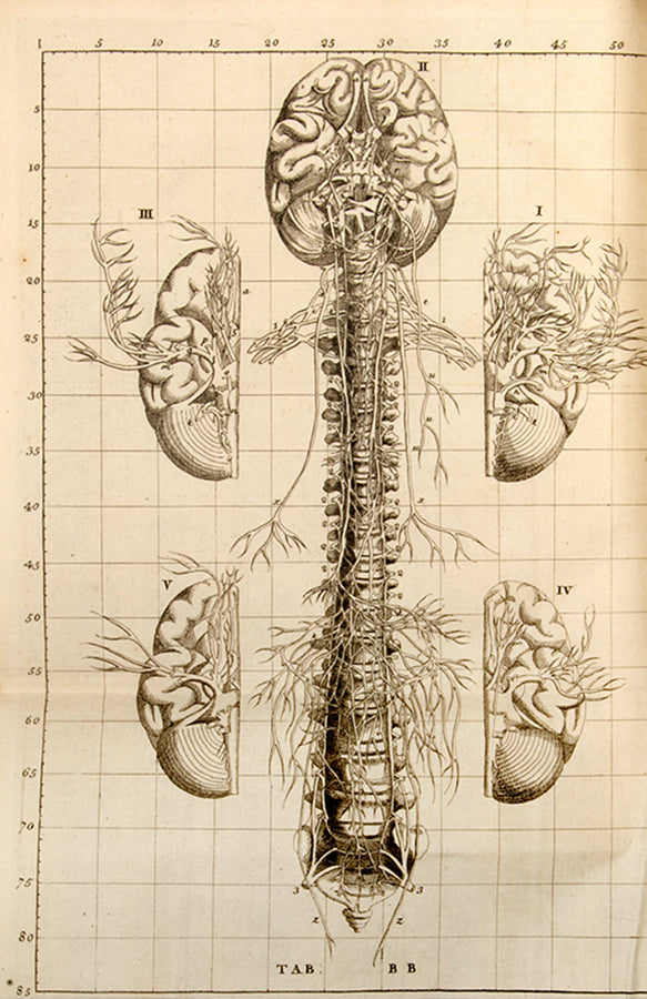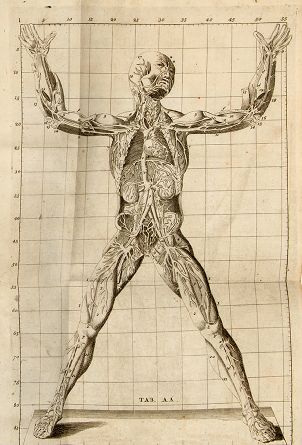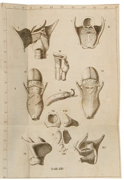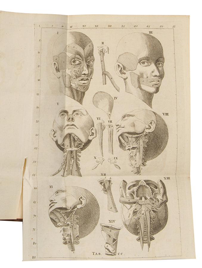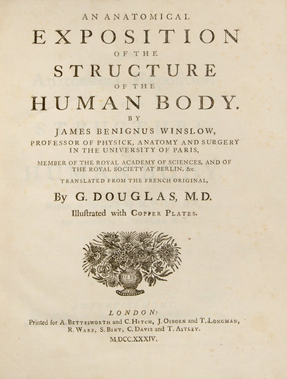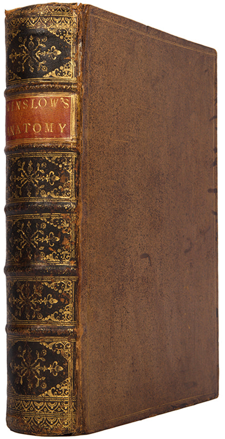 Reissue of the 1733 first English language edition with cancel title dated 1734, originally published in French as Exposition anatomique de la structure du corps humain in 1732. Illustrated with four attractive folding plates based on the works of Eustachius.Jacques-Bénigne Winslow (1669-1760), 'one of the most brilliant anatomists of the eighteenth century', was born in Denmark but spent his career in France, serving as a professor of anatomy at the Jardin du Roi between 1742 and 1758. 'Among his numerous contributions in the field of human anatomy, the Exposition anatomique de la structure du corps humain (1732) had a great influence on anatomical literature for over a century' (Olry, 'Winslow's contribution...', Journal of the History of Neuroscience, August 1996). A copy of the 1756 London edition was one of the books sold by Thomas Jefferson to the Library of Congress in 1815.