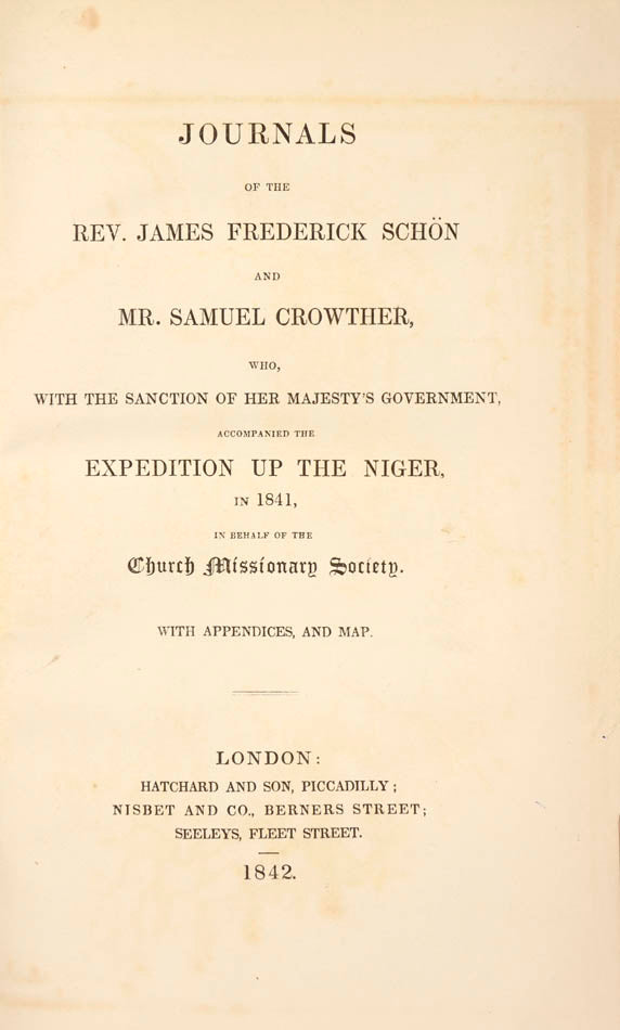'In 1841 Crowther was employed as interpreter for the ill-fated Niger expedition, which attempted to establish a model farm at Lokojo, at the confluence of the Niger and Benue, to demonstrate the benefits of "Christianity, commerce and civilization". There he formed a friendship with the German scholar J. F. Schön, with whom he wrote the account of the expedition published in 1843. The deaths of so many Europeans in the expedition appear to have convinced Crowther that Christianity could only be established in tropical Africa by Africans' (ODNB).