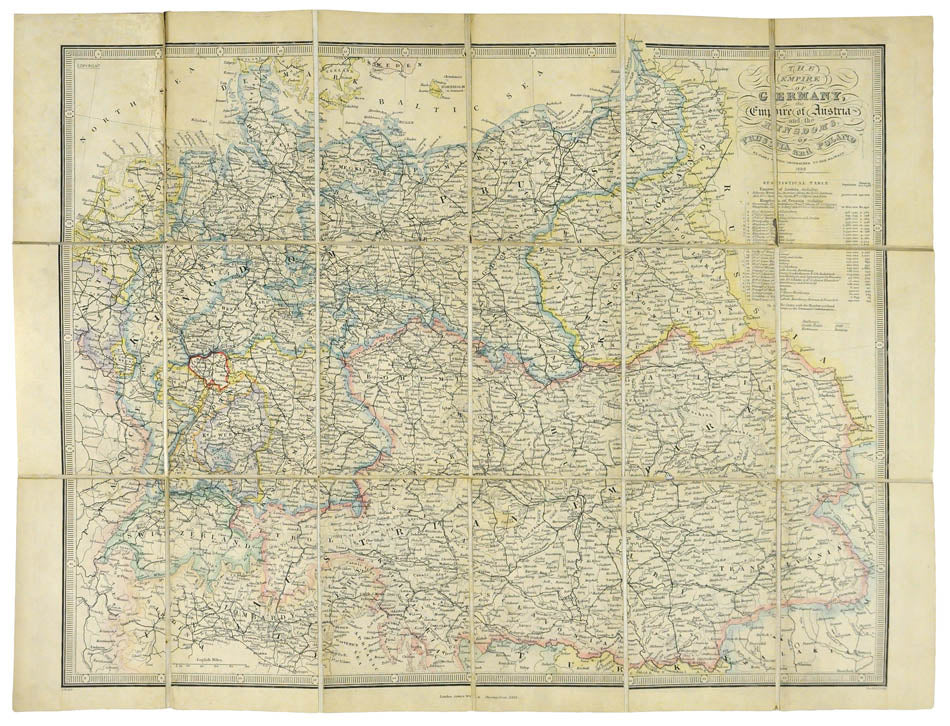 Hand-coloured engraved map, dissected and mounted on linen, torn along two folds ( not affecting the map image), a couple of small holes along folds, publisher's advert pasted to verso; folding into publisher's original red cloth covers, upper cover detached, publisher's label pasted to upper cover; overall a good copy.