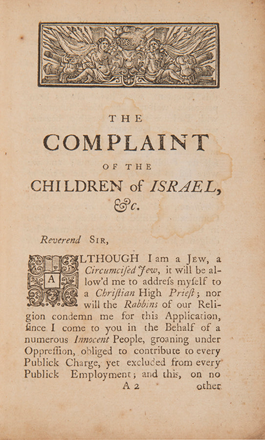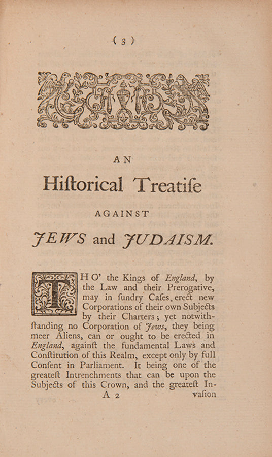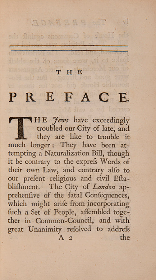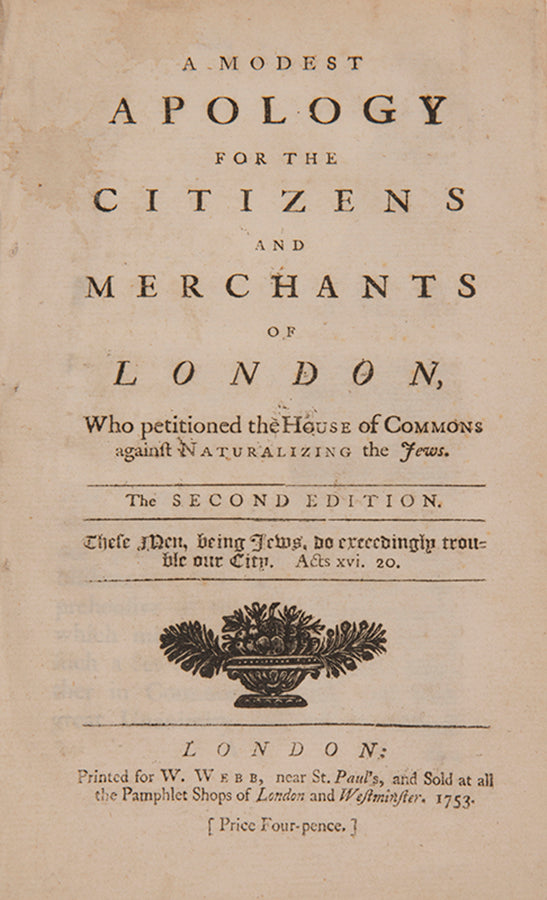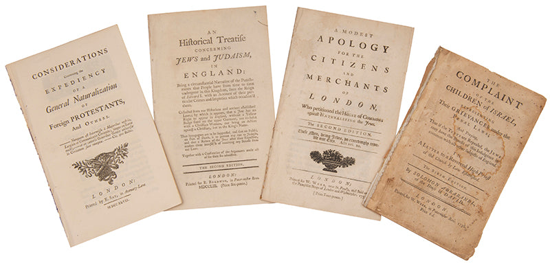 Political pamphlets. Four tracts published in the lead-up to the ill-fated Jewish Naturalisation Act of 1753. The act (or 'Jew Bill') sought to remove the requirement for foreign-born individuals 'professing the Jewish Religion' (26 George 2 c.26) to receive Holy Communion as part of the naturalisation process, a stipulation which had hitherto prevented non-Christians from becoming British subjects. Despite receiving the royal assent, an anti-Semitic backlash stoked-up by propaganda misrepresenting the terms of the act led to its repeal the following year.