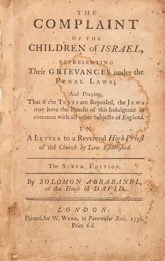 The last work is a satire by the political writer William Arnall (d.1736), writing under the pseudonym Solomon Abrabanel, a 'Circumcised Jew' (p.3). First published in 1736, the imprint is notoriously unreliable, and this sixth edition was a reissue of the second. Roth records that seven reprints were issued in 1753.