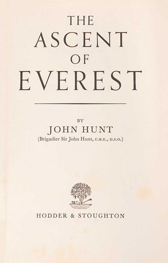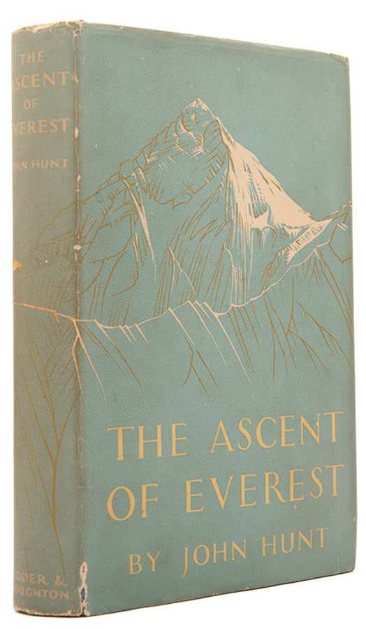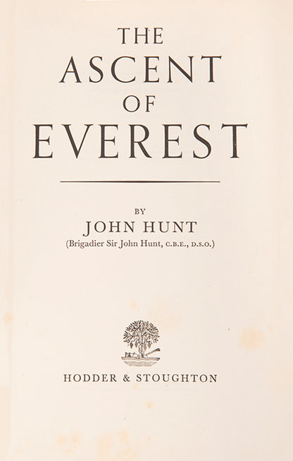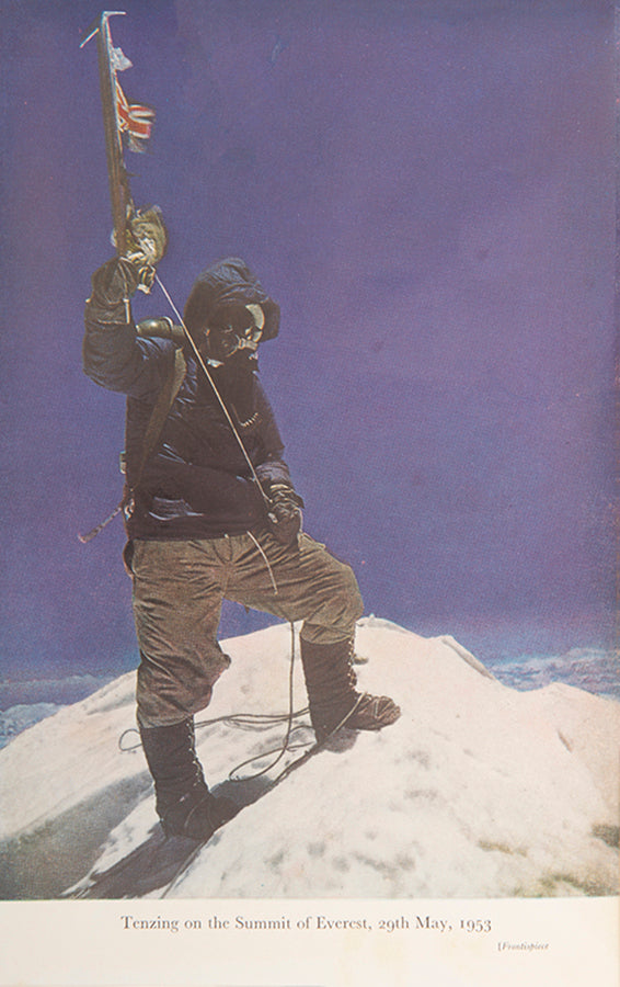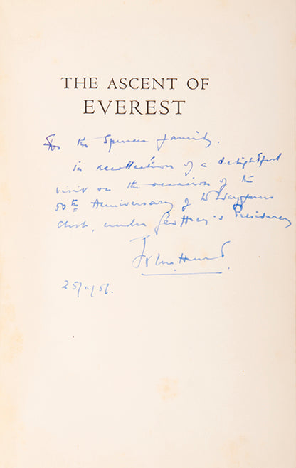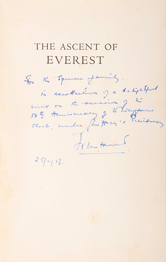 The inscription reads to "The Spencer Family in recollection of a delightful visit on the reunion of the 50th anniversary of the Wayfarer's club under Geoffrey''s presidency. John Hunt 22/11/56." The Wayfarers' Club was established in 1906 with the aim to encourage and promote mountaineering, rock climbing and mountain walking. Geoffrey Spencer was the president of the club in its 50th year of existence and this book has been dedicated to him by John Hunt in that year, when they met. It is a nice mountaineering association between the leader of the successful Everest expedition team and the president of this mountaineering club.