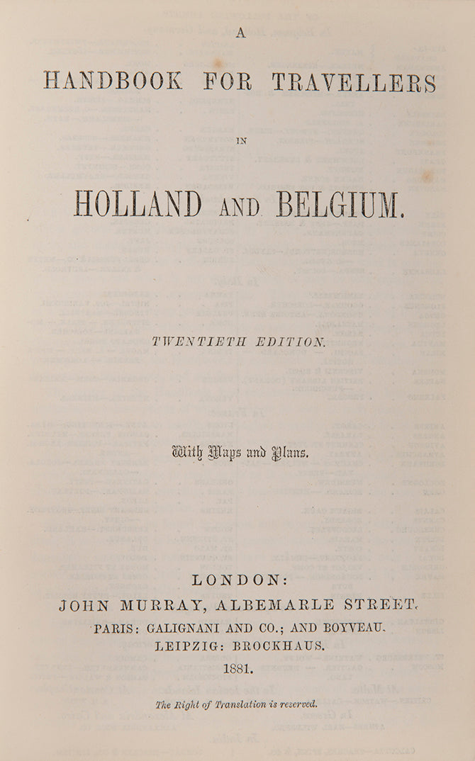 Endpapers dated "June 1887". Plans include the Hague, Amsterdam, Brussels and Antwerp and Liege.