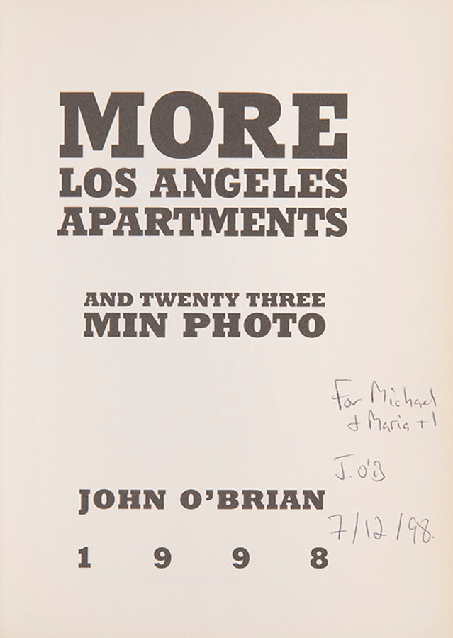 Presentation copy, inscribed: 'For Michael / & Maria +1 / J. O'B / 7/12/98.'Ed Ruscha's 1965 book Some Los Angeles Apartments included a photograph of The Capri, a building at 118 N. Normandie. John O'Brian's book More Los Angeles Apartments follows Ruscha's format and contains photographs of other apartment buildings on the same stretch of road.