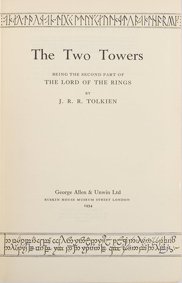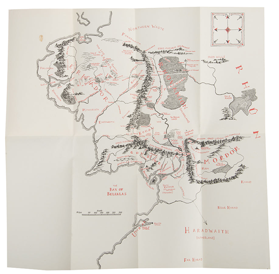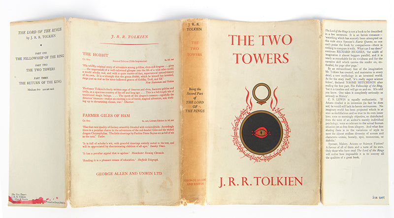 First editions, first impressions; 3 vols, 8vo; The Fellowship of the Ring: signature mark '4' at bottom of p.49, two maps, one of which folding and tipped-in at rear; The Two Towers: signature mark '4' at bottom of p.49, folding map tipped-in at rear; The Return of the King: signature mark '4' present on p.49 and text 'sagging' in the middle, folding map tipped-in at rear; very few minor marginal blemishes, light offsetting to endpapers; publisher's red cloth, gilt lettering to spines, red topstains bright, slight lean to spines and minor rubbing to corners, bleed from lower board of Two Towers to foot of jacket's rear flap and lower margin of final 2 leaves; original unclipped pictorial dust jackets printed in red, black, and gold, some toning and rubbing to spines, light wear at corners and small chips at foot of spines, Fellowship with 85mm split to fold of front flap, a very good unrestored set.