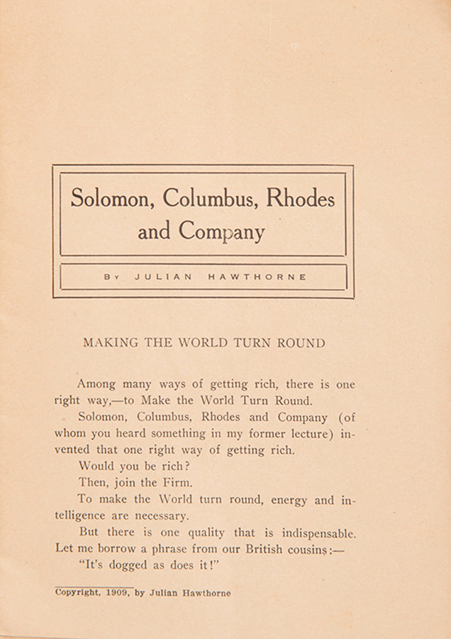 Novelist's son commits mining fraud. The first edition of this pamphlet promoting investment in the fictitious mining company Solomon Columbus Rhodes.