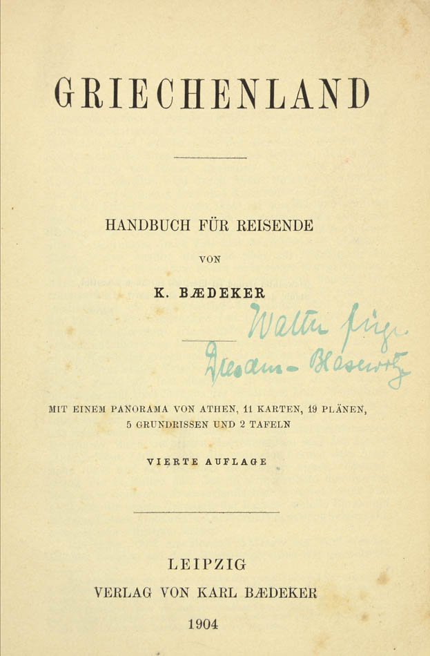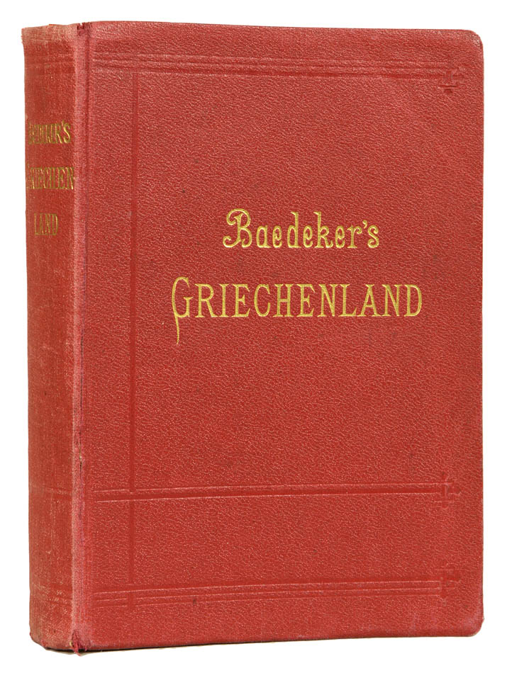 Fourth edition. cxxxiv, 438 pp, one panorama of Athens, (small part of the panorama lacking), 11 maps including map in rear pocket, 19 plans, 5 floorplans and 2 engraved plates, green ink writing on title-page. publisher's red cloth gilt.